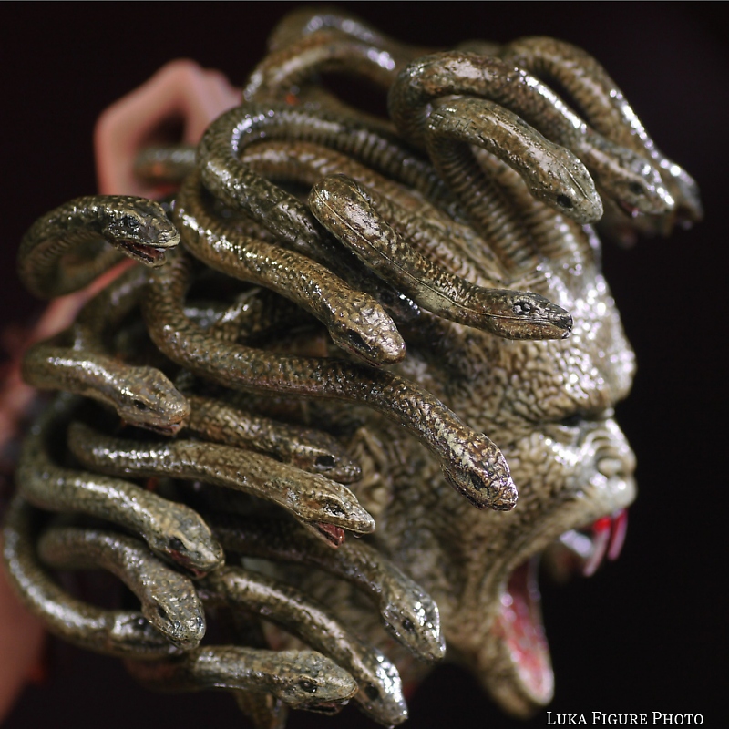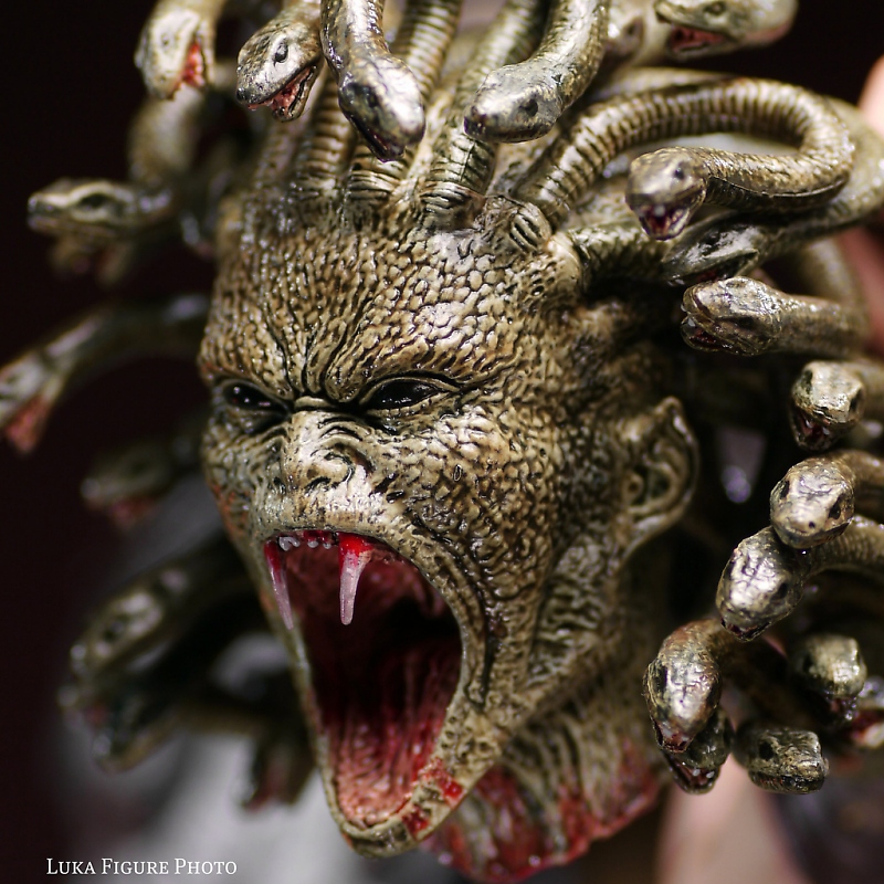 Perseus also includes his trusty scorpion armor shield which is beautifully rendered in three dimensional form with a natural-looking texture that enhances the figure's appearance on display. Medusa's severed head is yet another incredible accessory which accompanies this figure. The detail on each individual snake and her terryfying face is simply breathtaking.