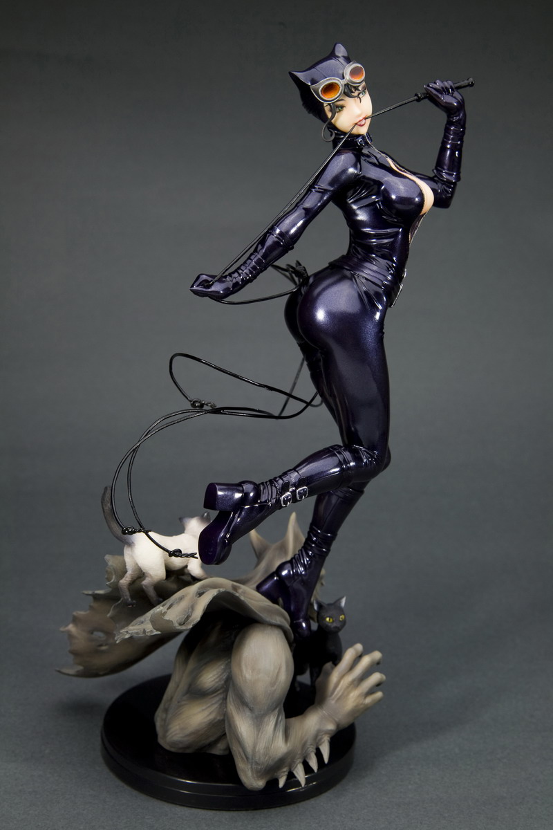 Catwoman is constructed of high-quality PVC plastic and stands approximately 9 1/10 inches tall (in an increased 1/7 scale for DC X Bishoujo statues) atop an exclusive Gotham City Batman-inspired gargoyle base complete with two miniature cats.