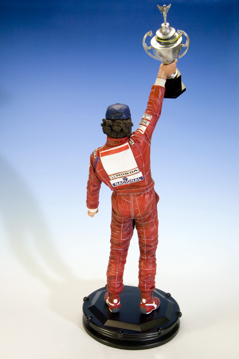Appearing as he did after winning the Brazil GP 1991, Senna stands triumphant with his right hand holding his trophy up in the air. Sculpted by Koei Matsumoto and Shinya Akao, the Senna Fine Art Statue has been officially approved by the driver's sister Viviane Senna. Senna stands 13 inches tall, and his special base is decorated with the Senna Foundation's 50th Anniversary logo and serial number. The logo is also prominently displayed on the anniversary packaging.