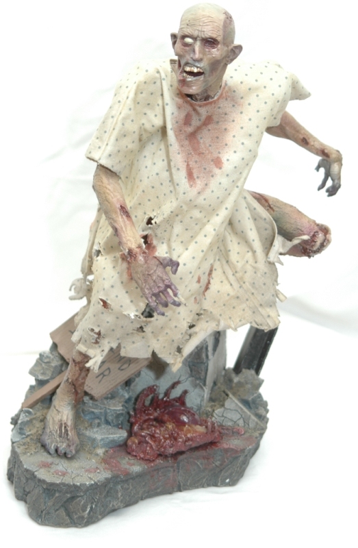 At 16" high, 12" wide, and nearly the same deep, the Undying Carcass is a sight to behold. Brought to life by a number of artists - including The Sideshow Collectibles Design and Development Team, Don Rutherford, Joe Allard, Kevin Ellis, Tom Gilliland and Martin Canale The Gore Group - the Undying Carcass reeks with detail. Truly a work of undead art, this escaped zombified patient, standing atop a broken pavement/stone base, looks as though he's both shocked to be moving and hungry for flesh.