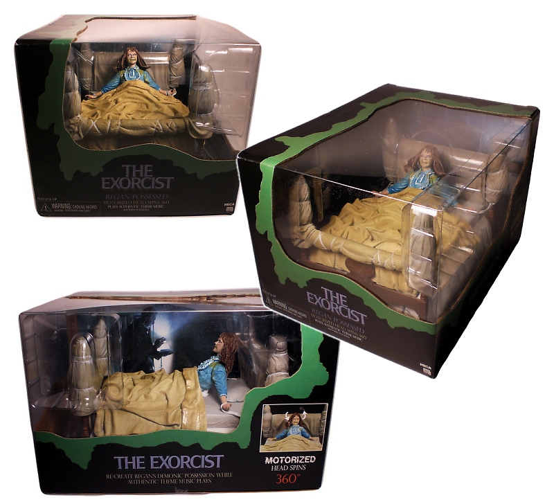OVERALL: After a very long wait and the fear that this piece would never see the light of day, NECA has finally managed to release perhaps the most iconic horror film collectible ever. Regardless of the paint inconsistencies on the figure, this is one hell of a collectible set and the electronic features enhance it even more. The Exorcist Possesed Regan box set, priced at around $35, is available now through many fine retailers, including BigBadToySTore.com, ToyWiz.com, and Urban-Collector.com.