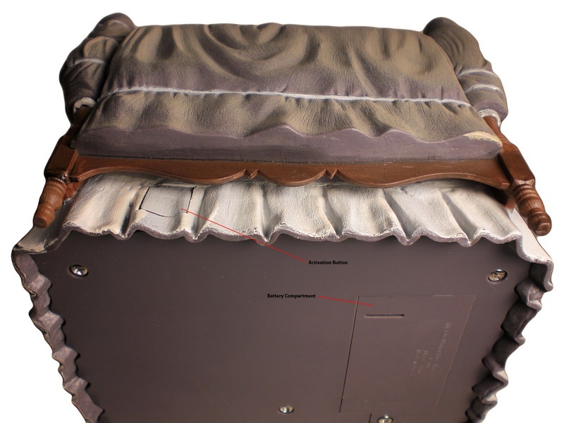 The bed has an activation button located at the bottom left portion of the back which plays the theme music from the film and activates the rotating head mechanism on the figure (see video above).