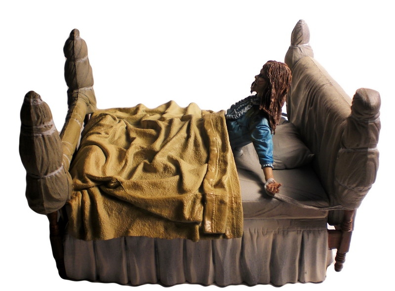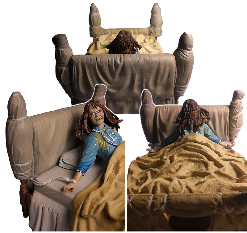 PAINT: It seems that more focus was placed on coloring the elements of the bed on this piece instead of the figure, which is a bit disappointing. While the weathered sheets and pillow on the bed look amazingly lifelike as a result of the detailed dual-toned airbrushing, Regan herself does not look as impressive. It's a shame that a lot of the amazing paint details from the prototype were not captured successfully on the final production piece. Overall, the piece is painted very well but the main element is not.