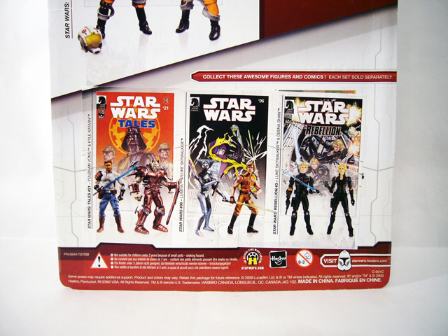 The back of the package has a photograph of the two figures along with a brief bio of the characters, while at the bottom are images of other current Comic Packs: Yuuzhan Vong & Kyle Katarn from Tales #21, Lumiya & Luke Skywalker from Star Wars #96, and Luke Skywalker & Deena Shan from Rebellion #3.