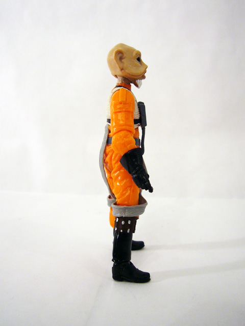 Both figures have phenomenal sculpts with intricate clothing details and layers. The orange suits are nicely textured and creased, while all over their outer surfaces are bits and pieces like the chest control modules (with attached hoses and straps) and shoulder toggles. Both figures have very distinctive new head sculpts. Plourr is a striking bald woman who’s actually quite pretty, while Dllr has the traditional large eyes and jowls of the Sullustans, with the interesting addition of a beard. In the paint department these figures shine as well. The bright orange jumpsuits contrast nicely with the various other colors like the gray harness and control panel, white padding, and assorted silver and black details. The flesh tones are dynamic, and the characters are further individualized by their blue eyes and red lips and white beard respectively.
