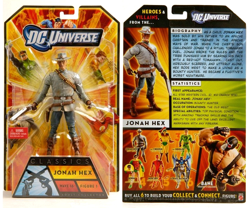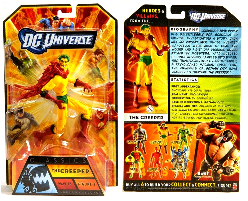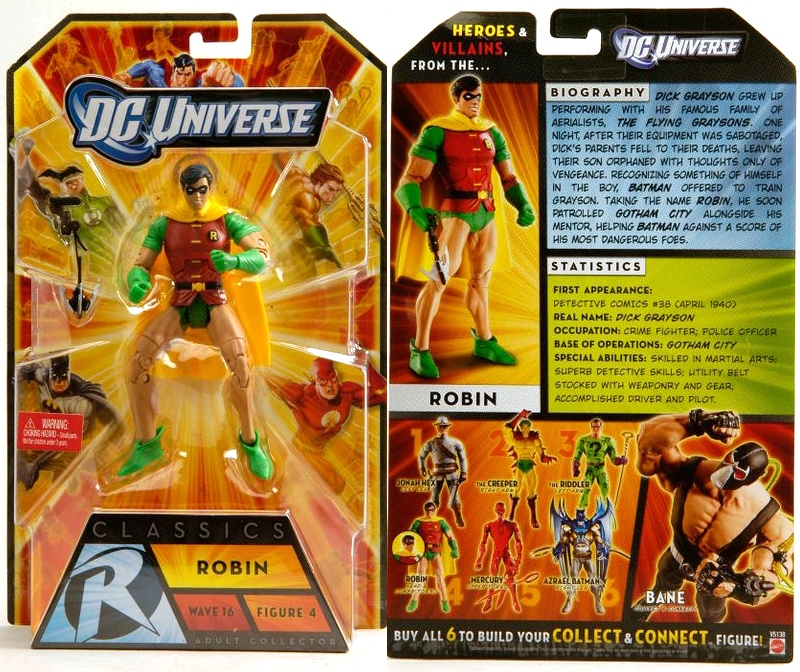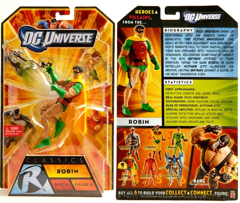 Mattel reveals new carded images of their DC Universe Classics Wave 16. This series includes Azrael Batman, The Creeper, Jonah Hex, Mercury, The Riddler and two versions of Robin, the two posed differently in their packaging. Collect all six figures for the bonus Collect and Connect Bane.