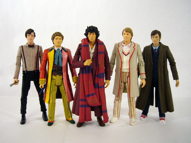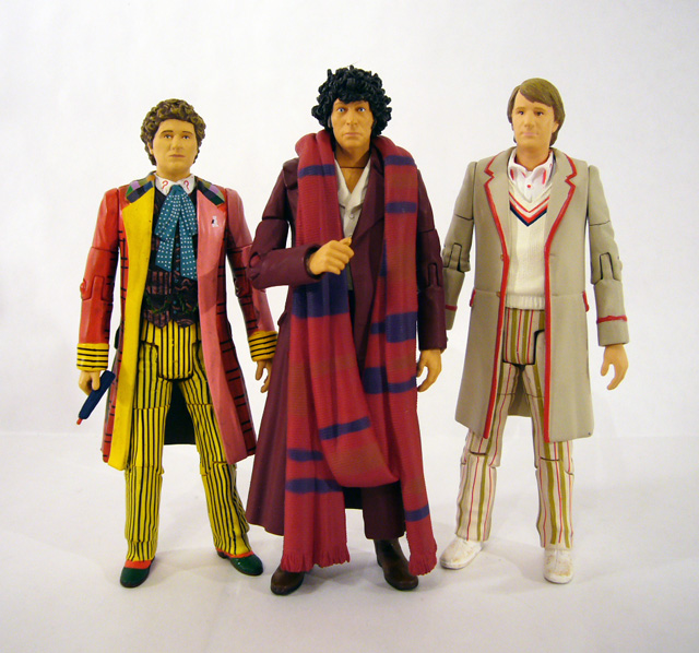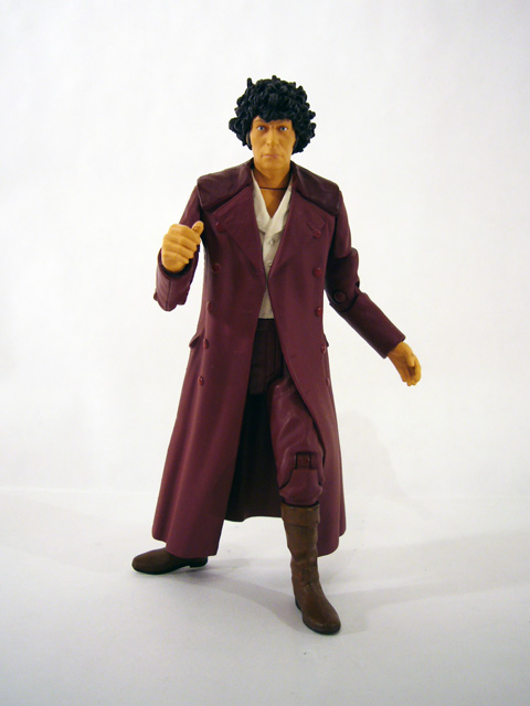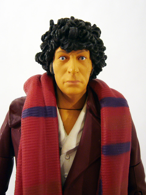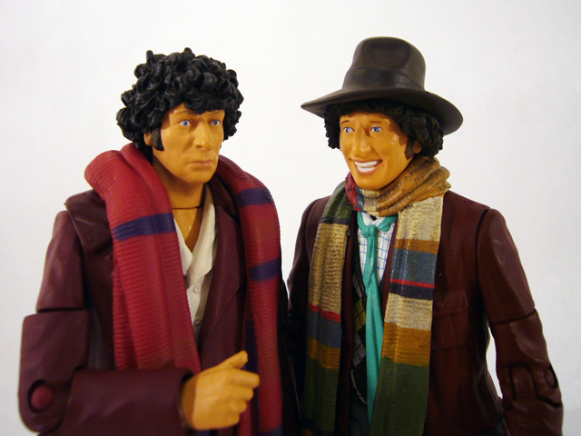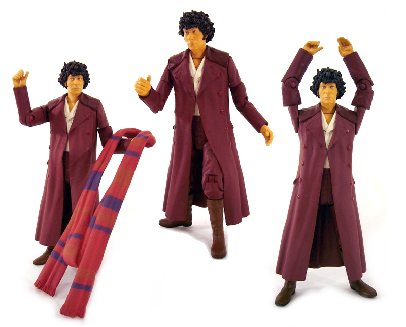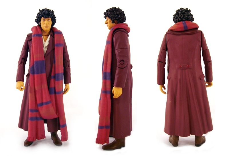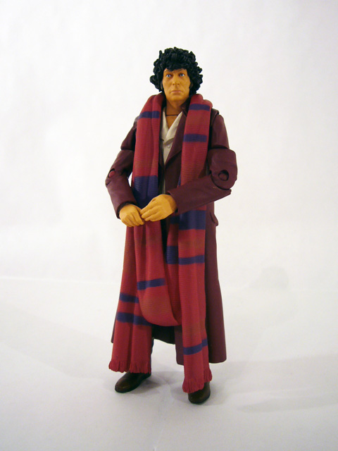 In the articulation department the burgundy Fourth Doctor has some upgrades based on the different sculpt. There are joints at the neck, shoulders, biceps, elbows, wrists, waist, ball-jointed hips, knees, and shins at the boot top. Poseability is pretty good, though the overcoat restricts the leg movement quite a bit. The Doctor has one accessory, a great red and purple scarf. It’s one solid piece of plastic that rests around his neck and hangs almost all the way to the ground (it’s a good thing the figure is so stable!). The color boost looks really nice on the figure, though again the scarf will restrict movement even more so it’s a tradeoff.