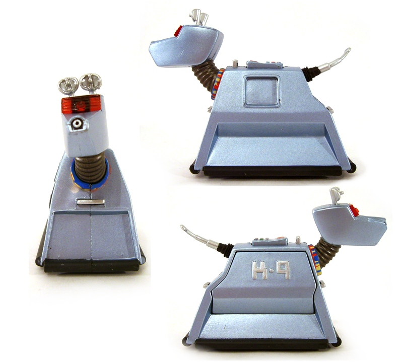 K-9 has appeared several times before in the Doctor Who figure line. It’s a really fun little robot dog consisting mostly of a blocky main body, head, and antenna-like tail. A mechanical being from a bygone age, K-9 doesn’t look exactly “futuristic” anymore, but he sure is cute. A cool metallic blue, one side of the dog has a small screen, while the other is emblazoned with his name in silver. Its head is attached by an accordion neck in gray, at the base of which is a multi-colored “collar.”