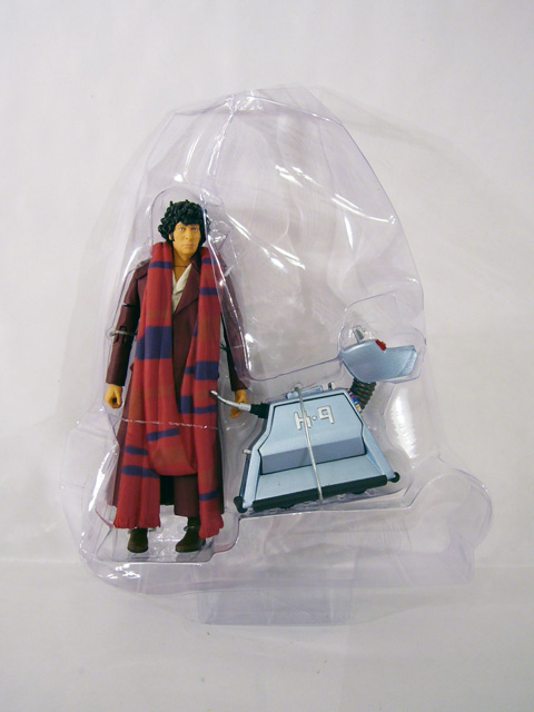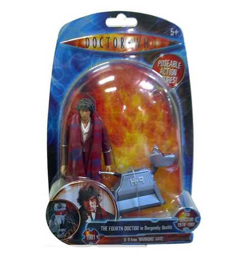 This dynamic duo comes packaged in the standard Doctor Who Classic clamshell. The card insert behind the figure has the Doctor Who logo at the top along with the notation “Poseable Action Figures!” Directly behind the figures is a blazing inferno image surrounded by a swirling blue background similar to that on other Who products. At the bottom of the package are photos of the Doctor and K-9 from the show, their names, and references to the year and name of the episode’s appearance. The back of the package has a ton of information with separate biographies for both characters as well as a line of symbols listing the dates of all Classic Doctors.