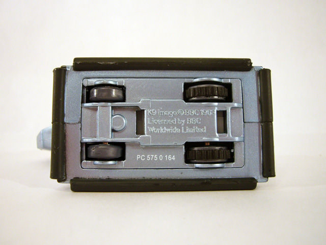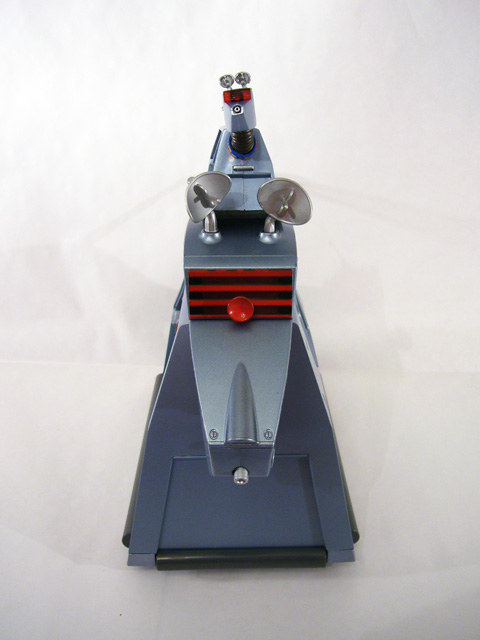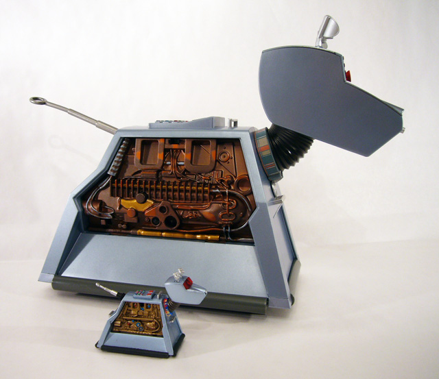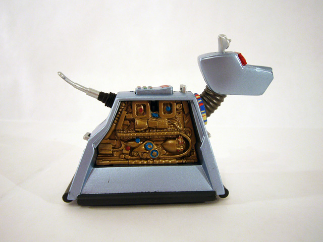 The dog’s head is also blocky and squared off, with two tiny satellite dish ears, a red reflector visor and a tiny laser mounted in its “nose.” K-9’s chest, back, and rear panels each have a silver handle, while the telescoping silver tail juts out from a black housing. A control panel covered in different colored buttons on K-9’s back is a button; press it and the side panel with his name pops off to reveal mechanical guts. The dog is pretty much perfect with regards to sculpt, paint, and size, and it even has wheels and pull-back motor!