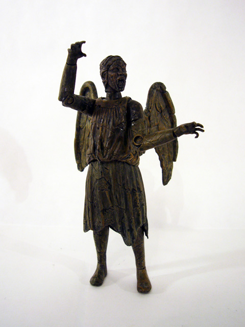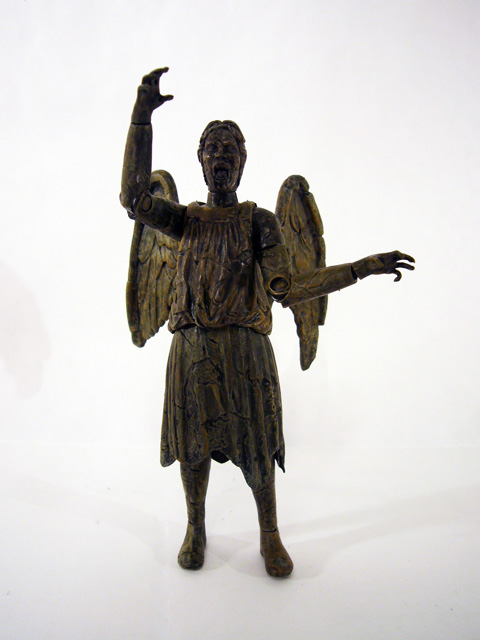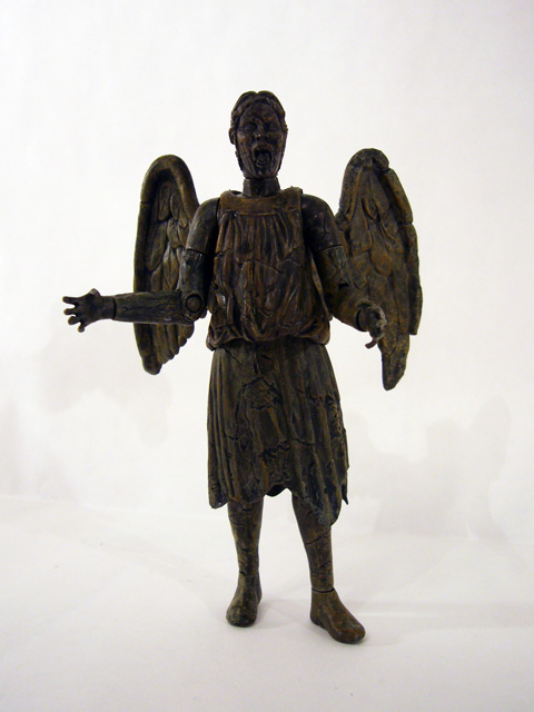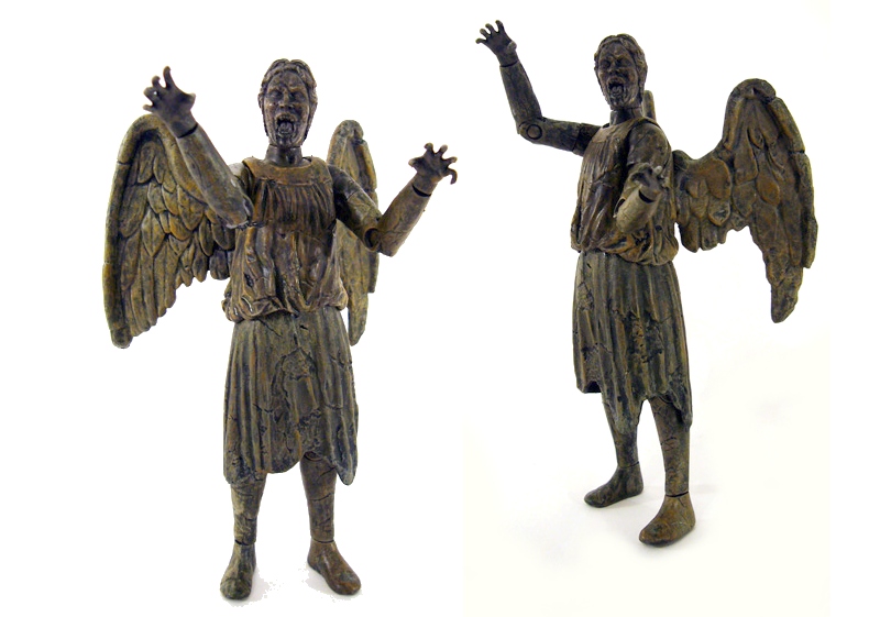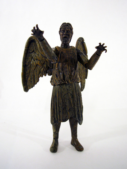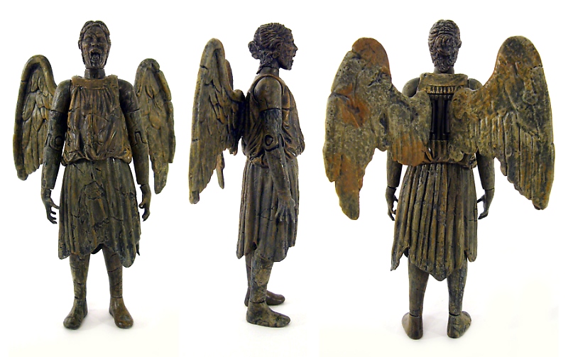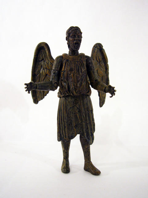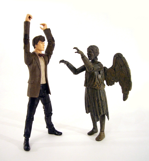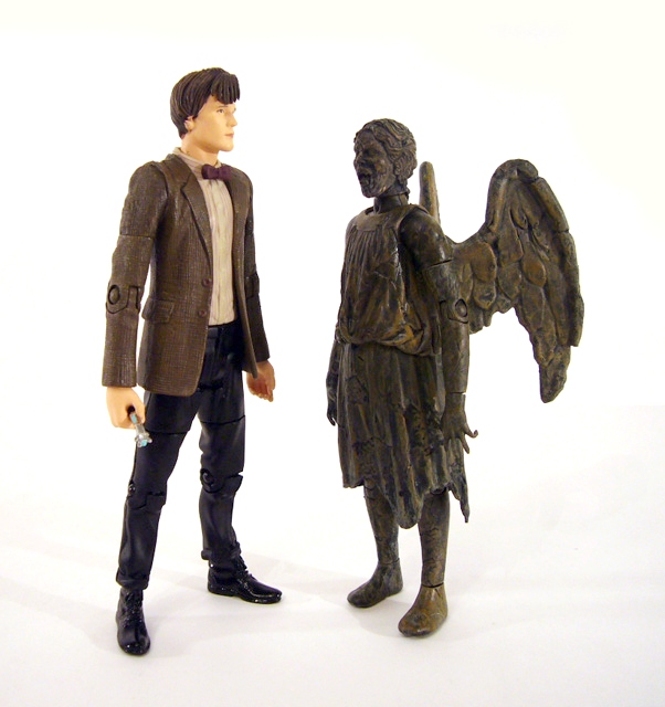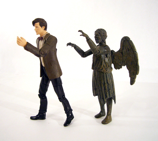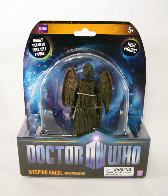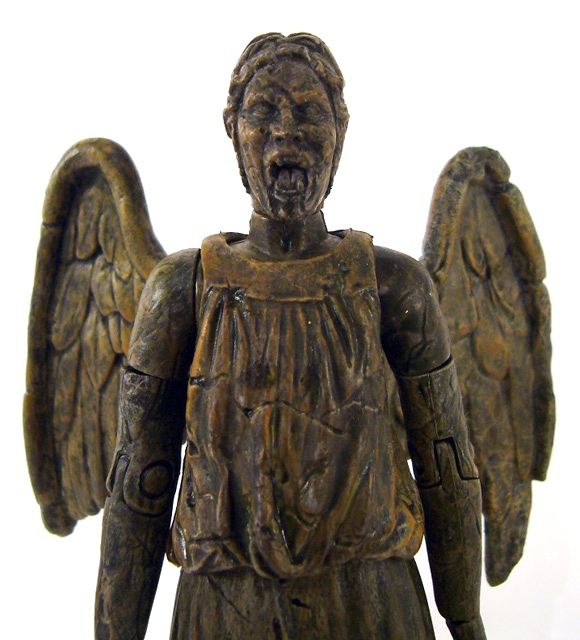 In a nutshell, the Weeping Angels are aliens that look like creepy angel statues. They feed off of different kinds of energy and can kill (or at least send you into a different time) with but a touch. Their only weakness is that they are frozen in time and space, or “quantum locked,” when a sentient organism is looking at them. That’s what gives rise to the popular warning “Don’t even blink.” In their Season 3 appearance the Angels were majestic and frightening, but when the Doctor encountered them again in “The Time of Angels” a colony had become stuck on a lonely planet and they were falling into disrepair. Hence the appearance of the new figure is quite different from that of the original. The Regenerating version still looks like an angel statue, but this one is chipped and cracked and overall worn.