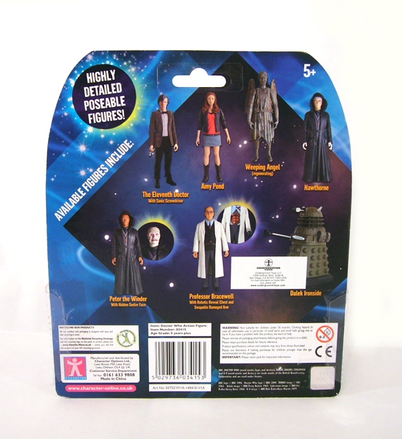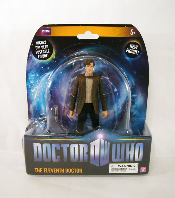 With the current Series 5 the Doctor Who figures have received a whole new look with regards to packaging. While the previous figures came on tall cards with the red and yellow swirl and TARDIS-shaped bubble, the new packages are darker and more stylish, taking advantage of the updated logo and overall different tone. The package is still a bubble on card configuration, but with a wider and shorter footprint. In front of the figures is an insert with the show's title, the names of the characters, and Underground Toys’ information. The card itself (identical within each wave) has the dark blue swirl of the time stream along with the BBC logo and the exciting "Highly Detailed Poseable Figure!" and “New Figure!” announcements.