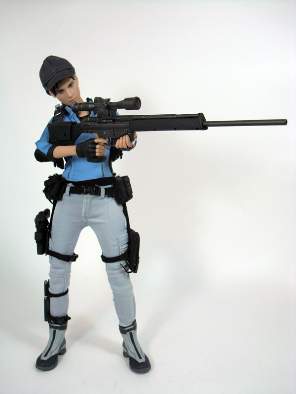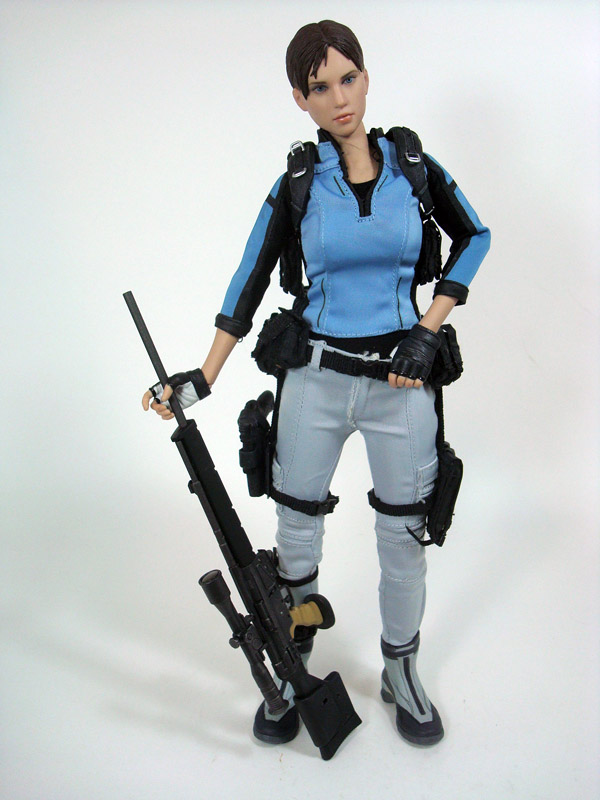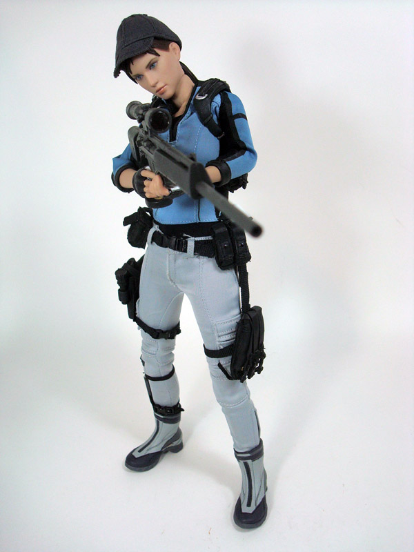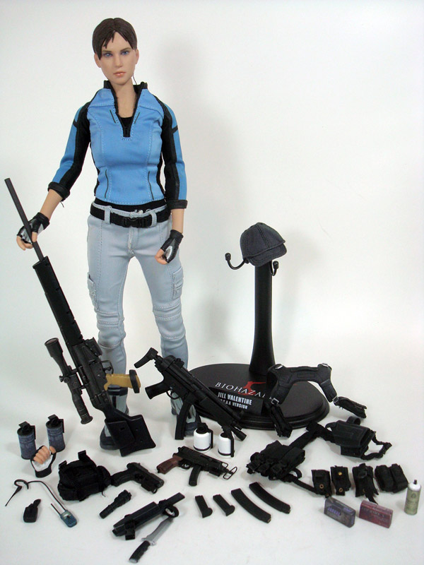 In addition to the clothing and accessories, Jill comes with a nice assortment of guns and misc. gear to help her drop some zombies. She includes a handgun, two flash grenades, two regular grenades, two different machine guns, a sniper rifle, First Aid Spray, two ammo boxes, a flashlight, two extra machine gun clips and two extra handgun clips. I’m sure most of these accessories are repeats of previously released weapons and have proper names, but they weren’t specified on Hot Toys site like they usually are.