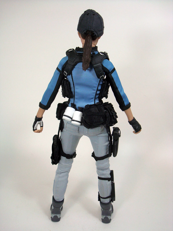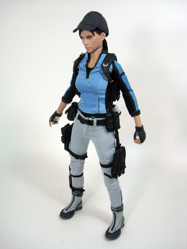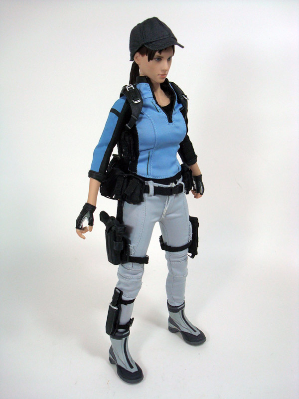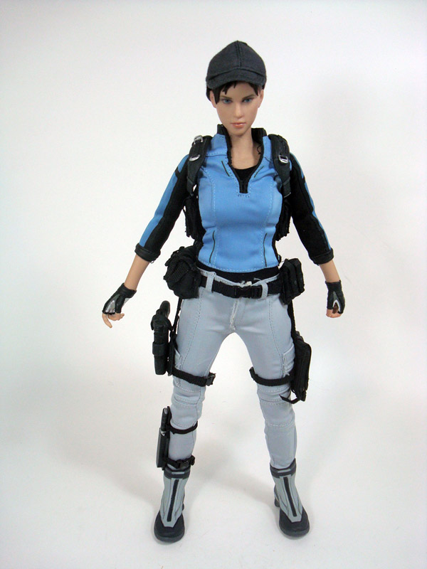COSTUME & ACCESSORIES: As with the other Resident Evil characters, the place where the figures really shine is in the way of gear and weaponry. Jill’s form-fitting clothing consists of a blue long sleeve shirt and grey pants with sculpted grey boots and a removable tactical vest. In addition she sports a clippable belt with several pouches including a holster and magazine pouch that hang down and clip around her legs. Each of these items features an assortment of buckles, studs, and rivets to add to the realism. Jill also includes five interchangeable hands and a standard Hot Toys display base with the Biohazard 5 logo.