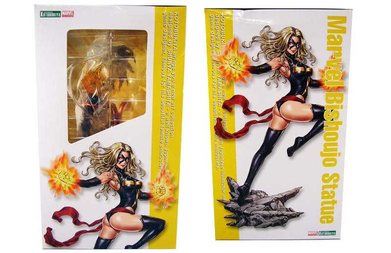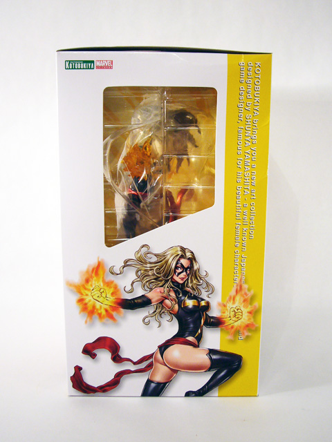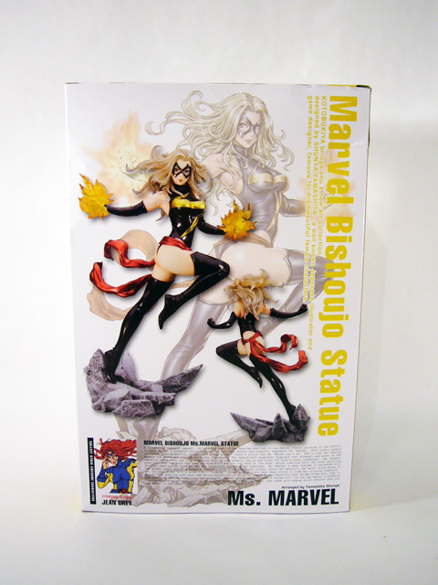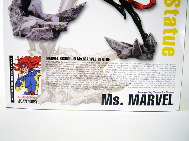 Best of all is the new illustration of Ms. Marvel by Shunya Yamashita; some version of it appears on every panel of the box. The sides include a brief description of the Marvel Bishoujo line, while the back panel has a full length photo of the statue along with a comprehensive writeup at the bottom. Finally, there’s a small “coming soon” advertisement for the next statue, Jean Grey.