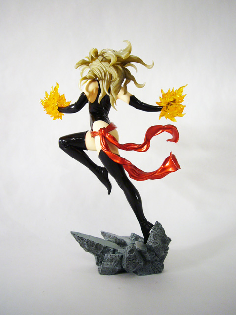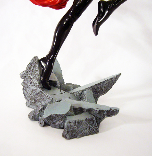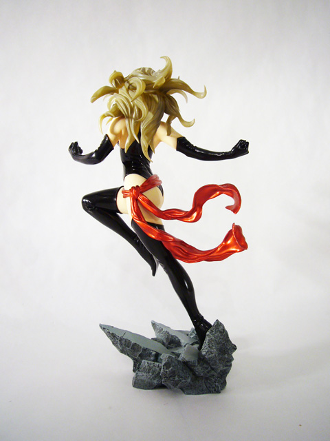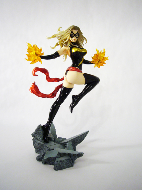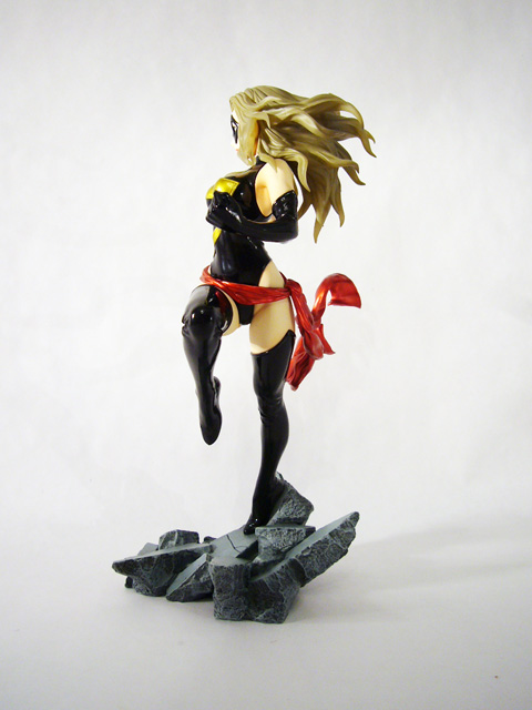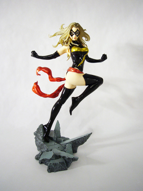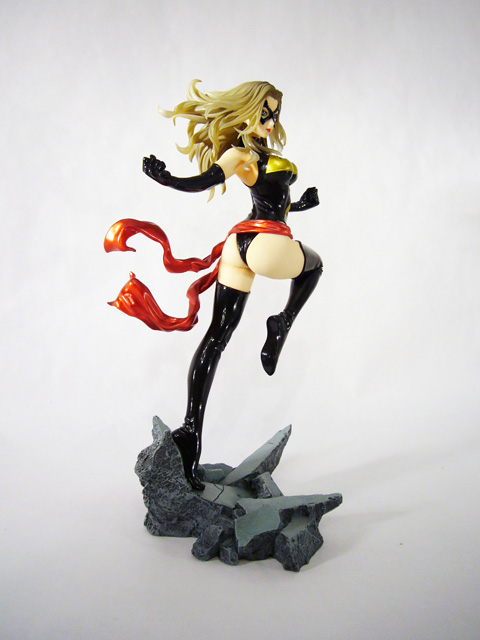 The superheroine Ms. Marvel is known for her power and strength, and those are exactly the qualities this statue portrays. Danvers, just over 9 inches tall, explodes into action, launching herself into flight with one leg still touching the ground and the other tucked up beneath her. Ms. Marvel’s hands are in mid-extension at her sides and you can see the flex of her arm as she raises them. Her body is amazing, muscular yet voluptuous, and her costume accentuates rather than hides her curves. Depending on the angle, you’ll most likely find your eyes drawn to Ms. Marvel’s nearly naked derriere, emphasized by her raised leg and her slightly twisted pose. The statue’s sculpt is excellent, really capturing the fantastical mix of softness and firmness inherent in female superheroes. Beyond the basic anatomy, Marvel’s costume is crafted with a smooth finish decorated with creases and stretching in the tighter areas. Of particular note is the head sculpt; Ms. Marvel has a beautiful bishoujo-styled face that looks great with her costume’s mask and her long tendrils of hair are quite detailed.