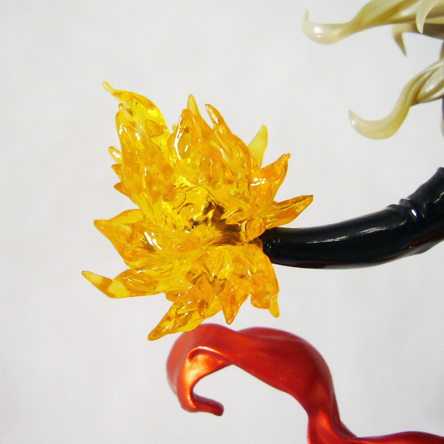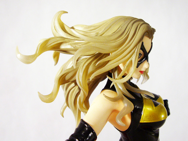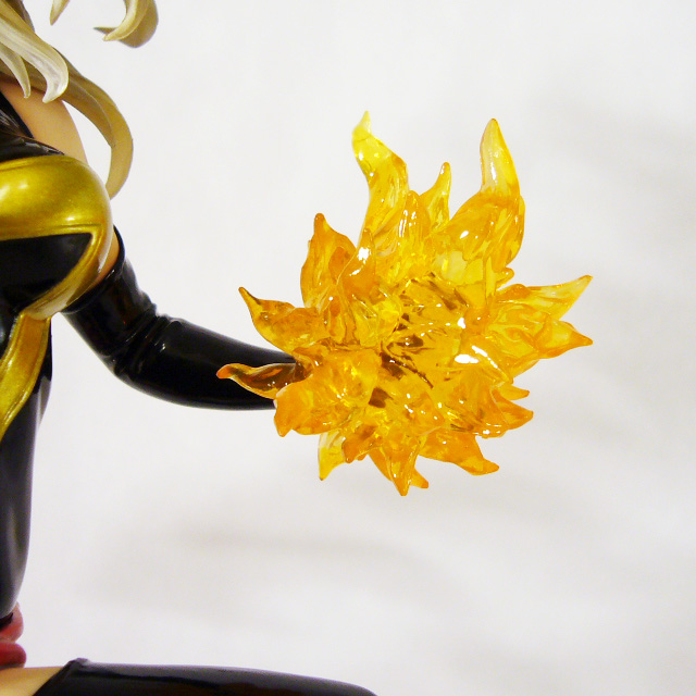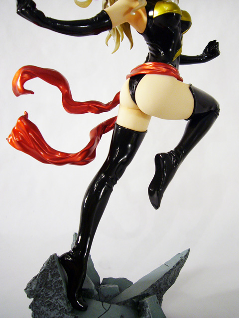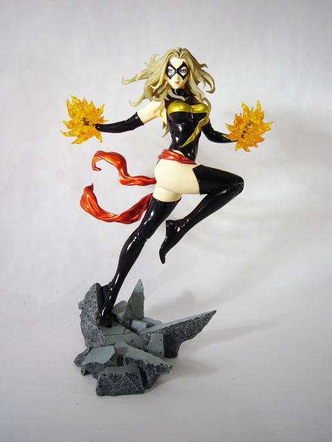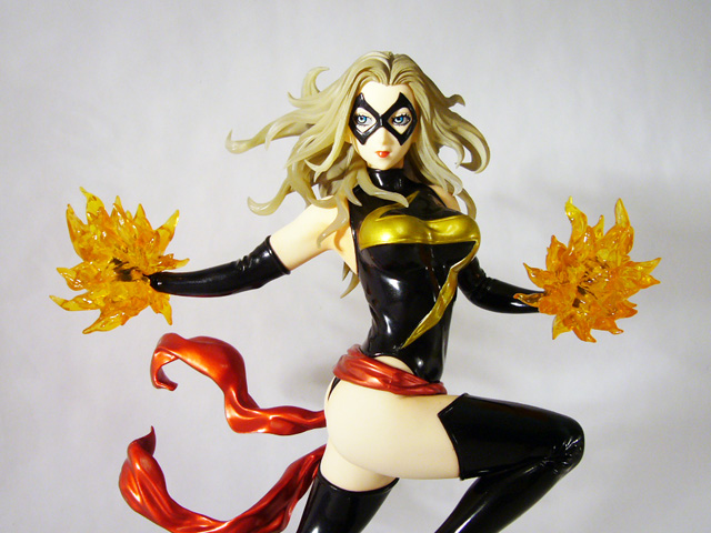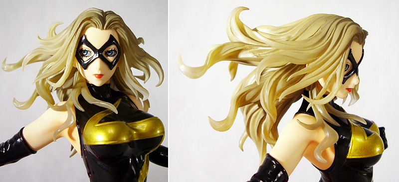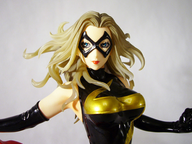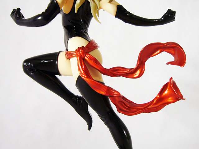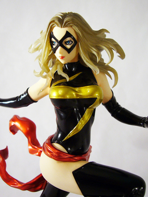 As a Bishoujo Statue, Ms. Marvel needs to look great in her one position, and that’s highly dependent on her paint job. Thankfully, the artists at Kotobukiya have succeeded in that respect as well. Ms. Marvel is full of great contrasts starting with her pale skin tone and her dark costume. Her bodysuit and matching sexy thigh high boots and long gloves are black with gold accents, all of which is done in a really high gloss (as is her cool metallic red waist cloth). Marvel’s face too uses alternating colors to great effect with the black mask, deep blue eyes, and bright red lipstick. The statue even employs translucent material for the heroine’s hair that combined with a golden-brown paint looks ethereal.