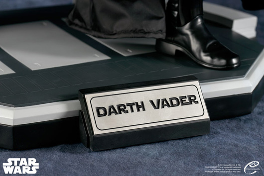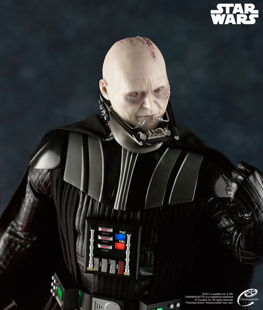 This towering approximately 29-inch tall statue features LED illuminated chestplate and lightsaber and three digital voice clips featuring the authentic voice of Lord Vader. Remove Vader's helmet to reveal the likeness of Anakin Skywalker, as portrayed by Sebastian Shaw, reproduced with realistic "silicon-skin". Also included is an "Imperial" display base with interchangeable nameplates.