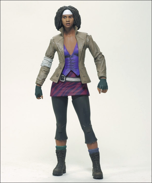 MICHONNE - Not long after moving into the fortress-like prison, Rick and his group of survivors were approached by a mysterious visitor from the zombie wasteland. With sword in hand, and two leashed zombies in tow, Michonne came to the prison seeking safety and shelter. Little did she know -- it would lead to her greatest enemy. Michonne survived the horrors of Woodbury, and her fearlessness and weapon proficiency quickly earned her a place as a trusted defender of the group.