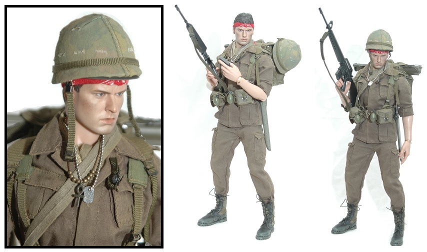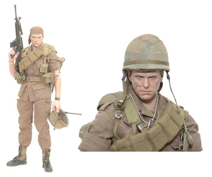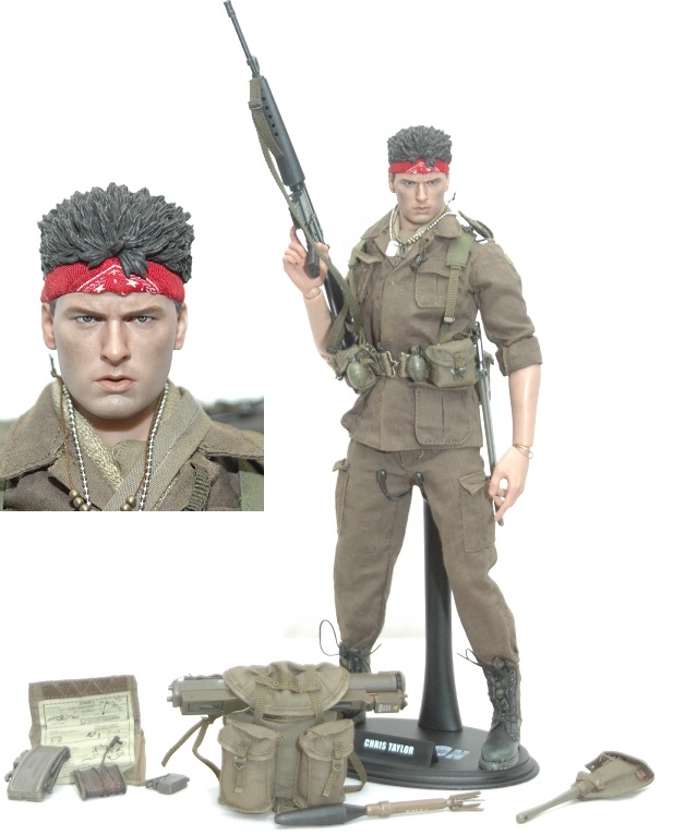 Both Barnes and Taylor feature film-accurate uniforms, including olive drab battle dress utilities (pants with belt, blouse, t-shirt) along with an army utility belt with pouches and olive drab and black jungle boots. Likewise, each includes a variety of accessories.