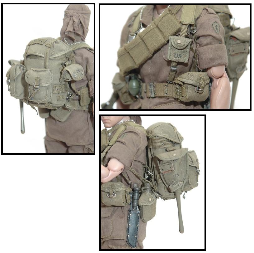 Barnes includes a rifle, a pistol, a magazine, a bayonet with leather-like sheath, a safe keeper with scabbard and two grenades as well as an olive drab head band, a helmet with camouflage cover, a necklace with dog tag and can opener, a pair of suspenders, a bandoleer, a compass pouch, a first aid pouch, a watch, a bracelet, a cigarette (which fits into the figure's hand), a rucksack, two canteens with covers, and an entrenching tool (E-tool) with cover.