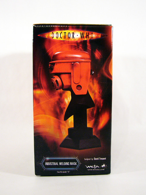 Weta’s miniature replica of the helmet comes to you in a very sleek box. Photos of the replica Welding Mask really pop over the black background and swirling red and yellow Doctor Who timestream patterns. The front panel is simple and sophisticated with a full frontal view of the helmet, its name in the bottom left corner, and logos for the show and Weta. One side panel shows the Mask’s profile, while the other has a close-up shot along with a description of the episode. The back of the box has an extreme close-up photo and rearview shot with a history of Doctor Who.