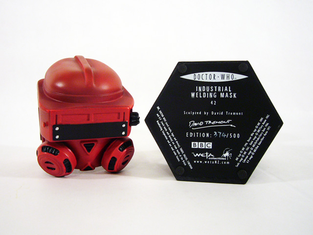 Weta’s miniature Industrial Welding Mask is a fantastic looking prop replica. Just taking it out of the box you can tell how much care and attention went into it. First off, it’s incredibly heavy for its size. At only three inches tall the cast metal mask by itself weighs nearly two pounds! Just like with Weta’s other miniature helmet lines (Lords of the Rings, etc.) the Doctor Who products come with model busts on which to mount them. The stand is about 6 ½ inches tall, a simple male head and torso made of black polystone on a hexagonal base. The bottom of the base has a bunch of information, a signature by sculptor David Tremont, and its individual number (out of 500). The mask fits snugly on the bust, and there’s built in padding so the top of the head doesn’t get scratched.