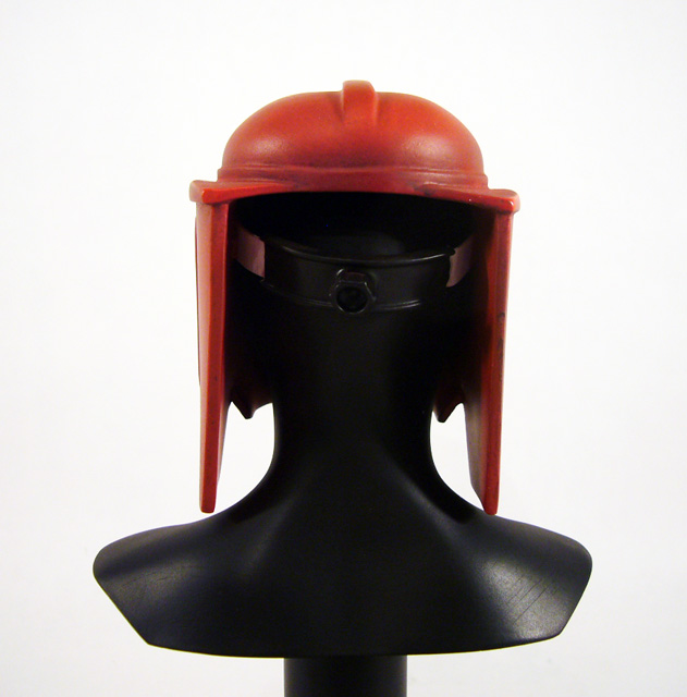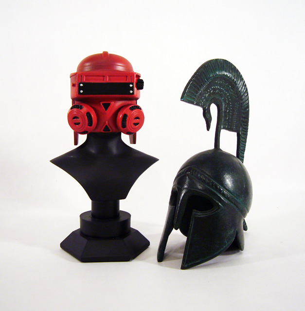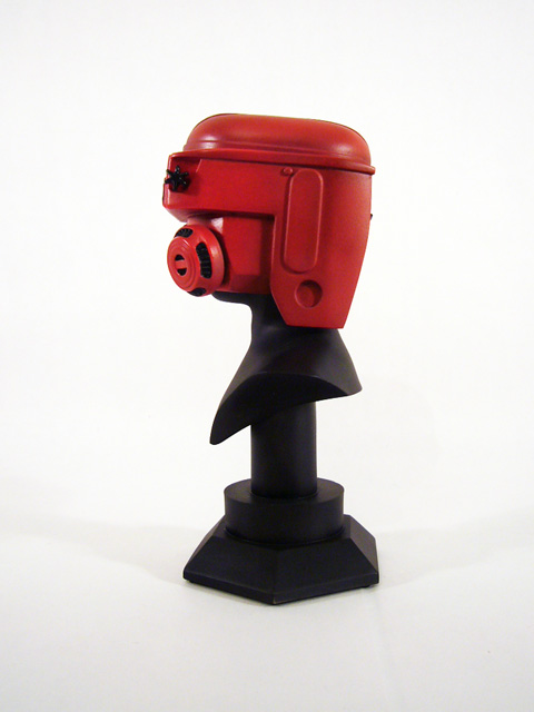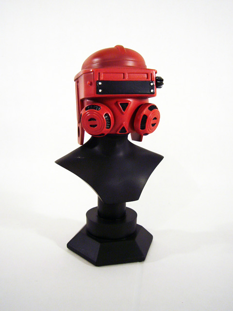 The Industrial Welding Mask is heavy duty protection for the most dangerous jobs. Instead of covering just the face it wraps around most of the head, only leaving a small part in the back exposed. The front is equipped with twin atmospheric filters on either side of the mouth area, and a heavy duty heat-shielded visor (with adjustment knob on the left). Add to that a bright fire engine red and black paint scheme and you’ve got a striking sci-fi prop.
