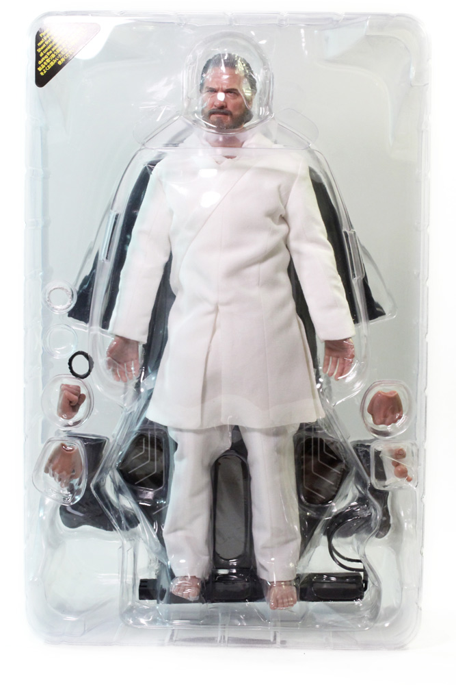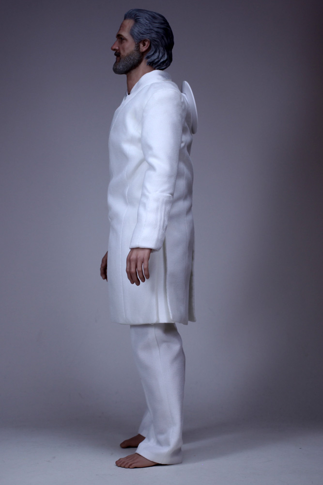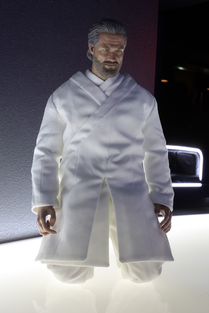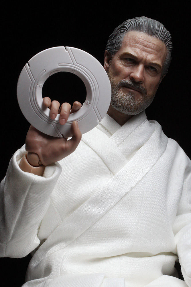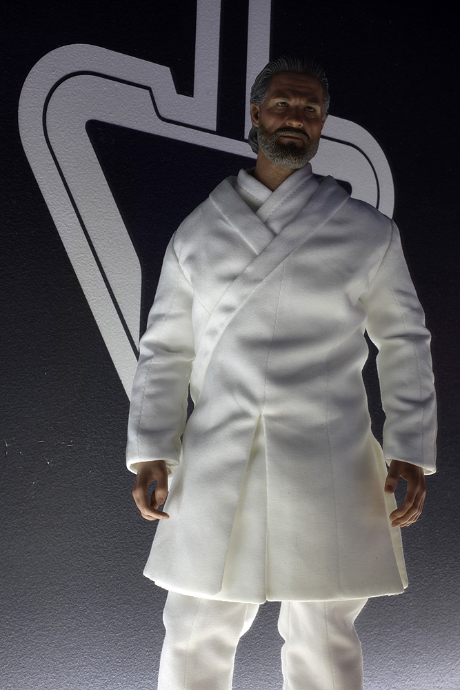 Speaking of costume, it's time to take a look at the accessories. Let's start with the outfits because in this box, you get two of them. There's a third outfit seen in the movie that isn't included here when (old) Kevin Flynn first meets Sam for the first time on the Grid. The outfit Kevin is wearing right out of the package is from the dinner table discussion scene. The white outfit consists of a pair of pants, long sleeved shirt, and a long sleeved robe with detachable data disc on the back. In this outfit, Kevin sports his Zen lifestyle with bare feet.
