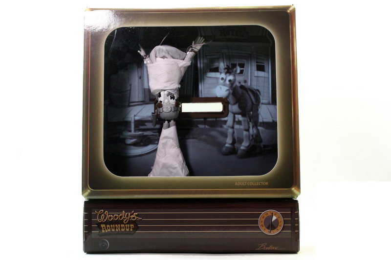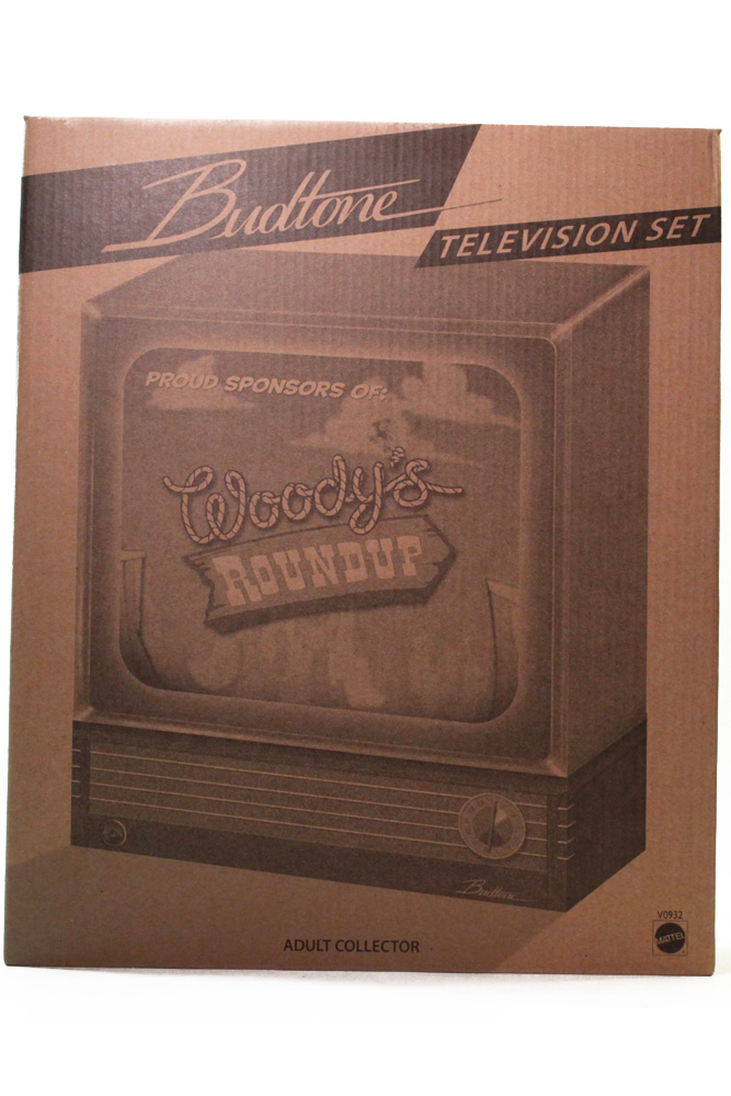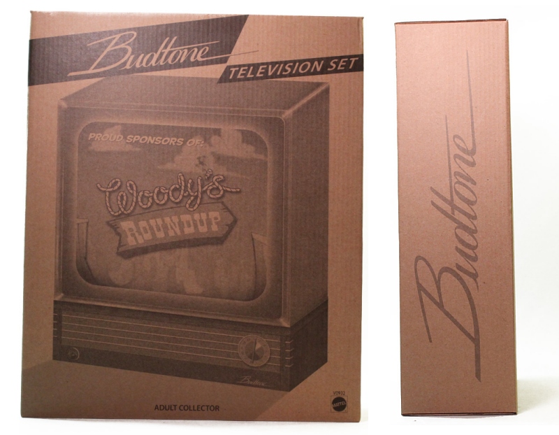 The brown shipper box resembles a brown cardboard box you may have seen in the '50s. It sports a retro design for the Budtone Television Set, proud sponsors of Woody’s Roundup. The faux TV brand may have a hidden meaning and the only one I can think of is that it's in reference to artist Bud Luckey, who helped design Woody and Buzz. In any case, where a plain, boring shipper box would have sufficed, I’m glad Mattel went the extra mile for this.