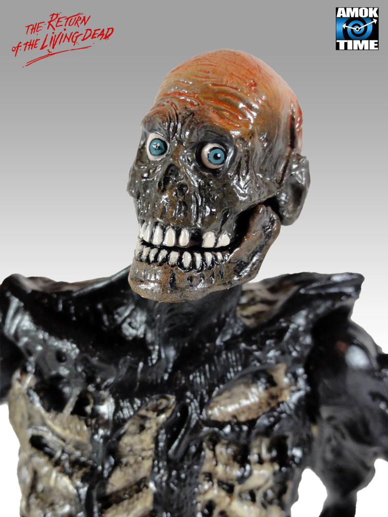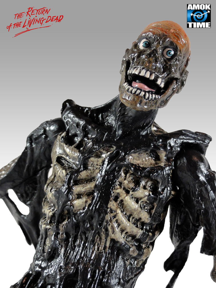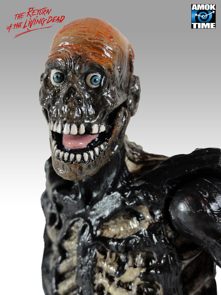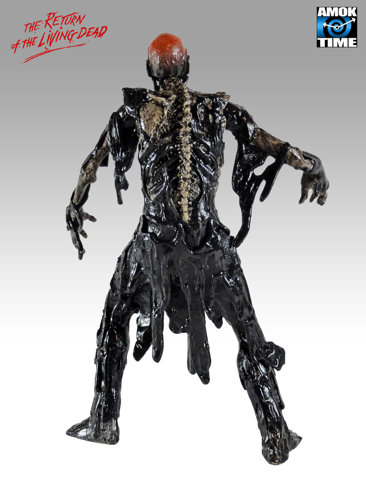 Forgotten and left for dead (wait, it's already dead!), Amok Time's "Tarman" Zombie action figure is at long last shipping soon. Arriving January 15th at amoktime.com, the Tarman marks the first ever action figure produced from the cult classic horror comedy Return of the Living Dead. The figure features ball jointed neck, shoulders, opening jaw and a themed display base with Trioxin cannister and bitten brain. $21.99 gets you one of the most memorable walking undead designs ever put on screen. Stay tuned for our in-depth Tarman review!