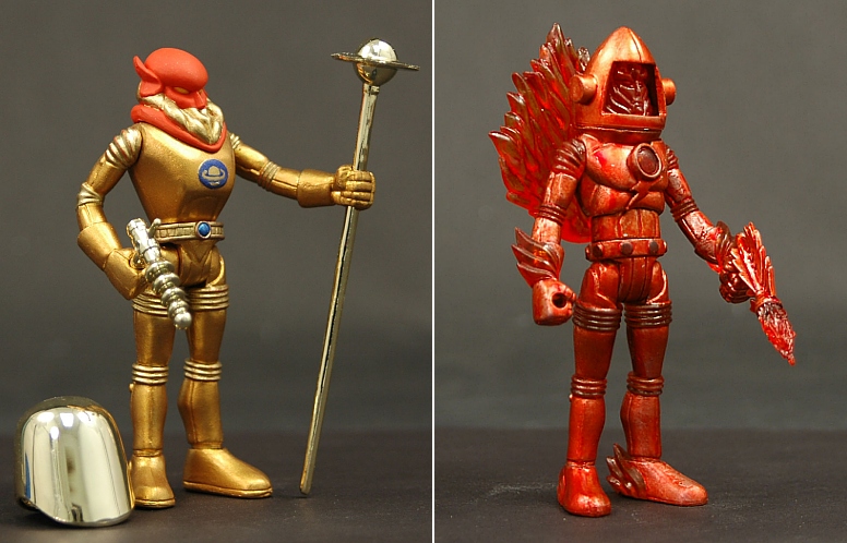 Earlier this week we told you about a new series of Outer Space Men from the Four Horsemen. Called the Outer Space Men Cosmic Creators Series - The Birnkrant Edition, these new figures feature re-imagined paint work by original OSM creator himself, Mel Birnkrant. Joining the previously revealed Metalmorpho and Deep Blue Astro-Nautilus comes new photos of the remaining two characters in the set: Goldiac and Blazing Inferno.