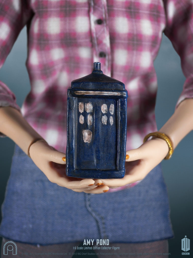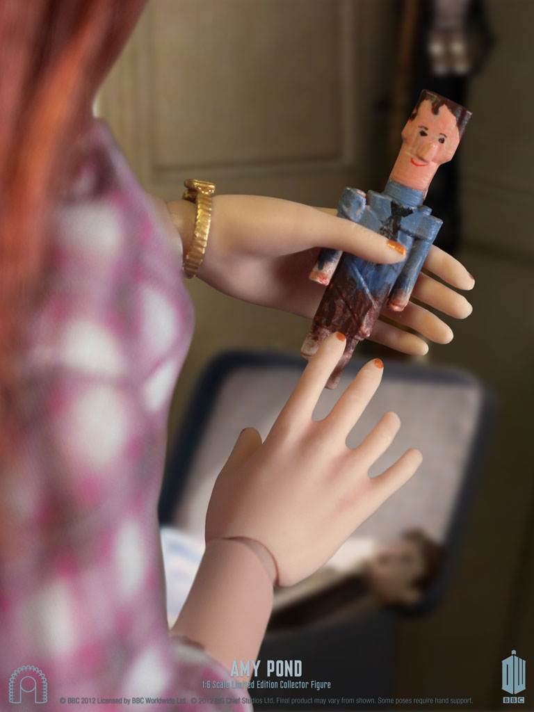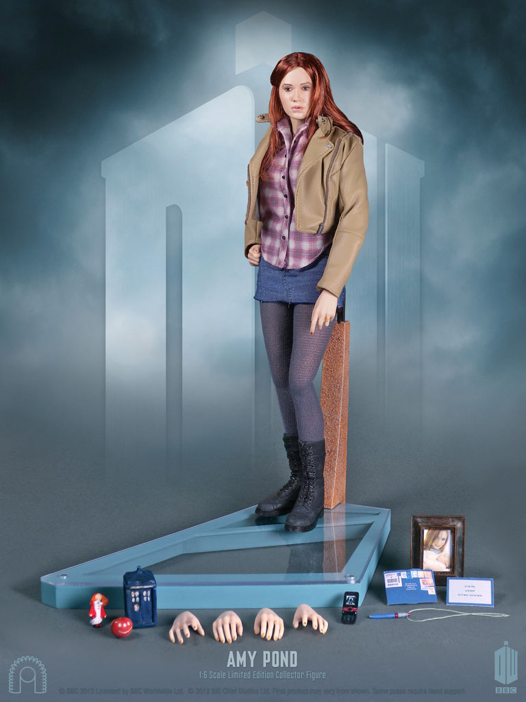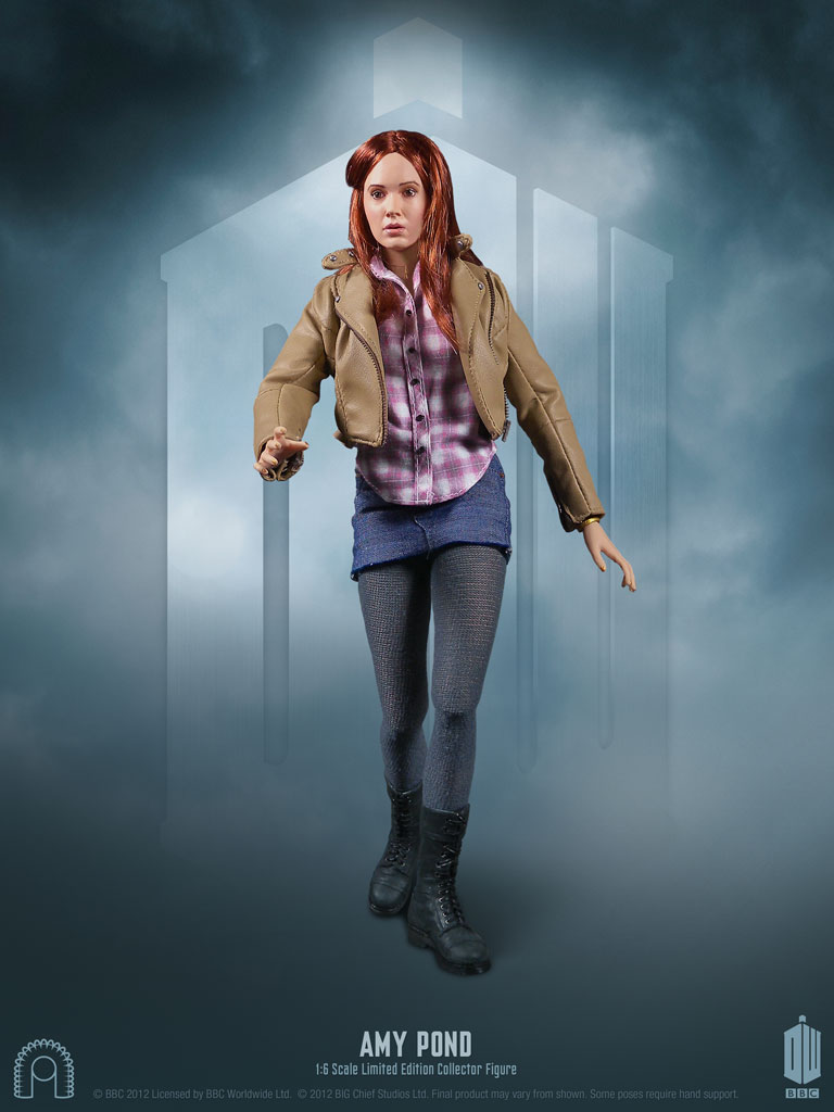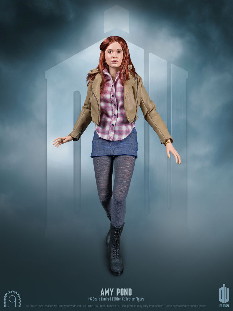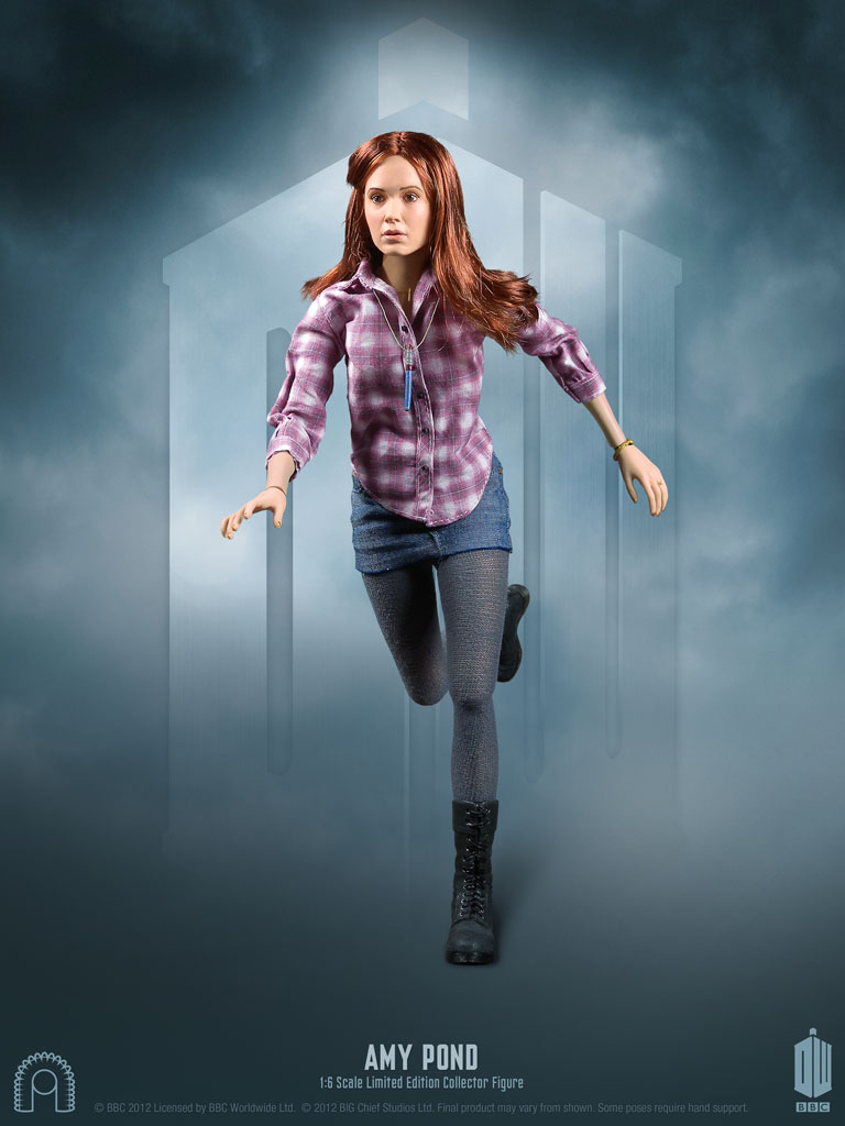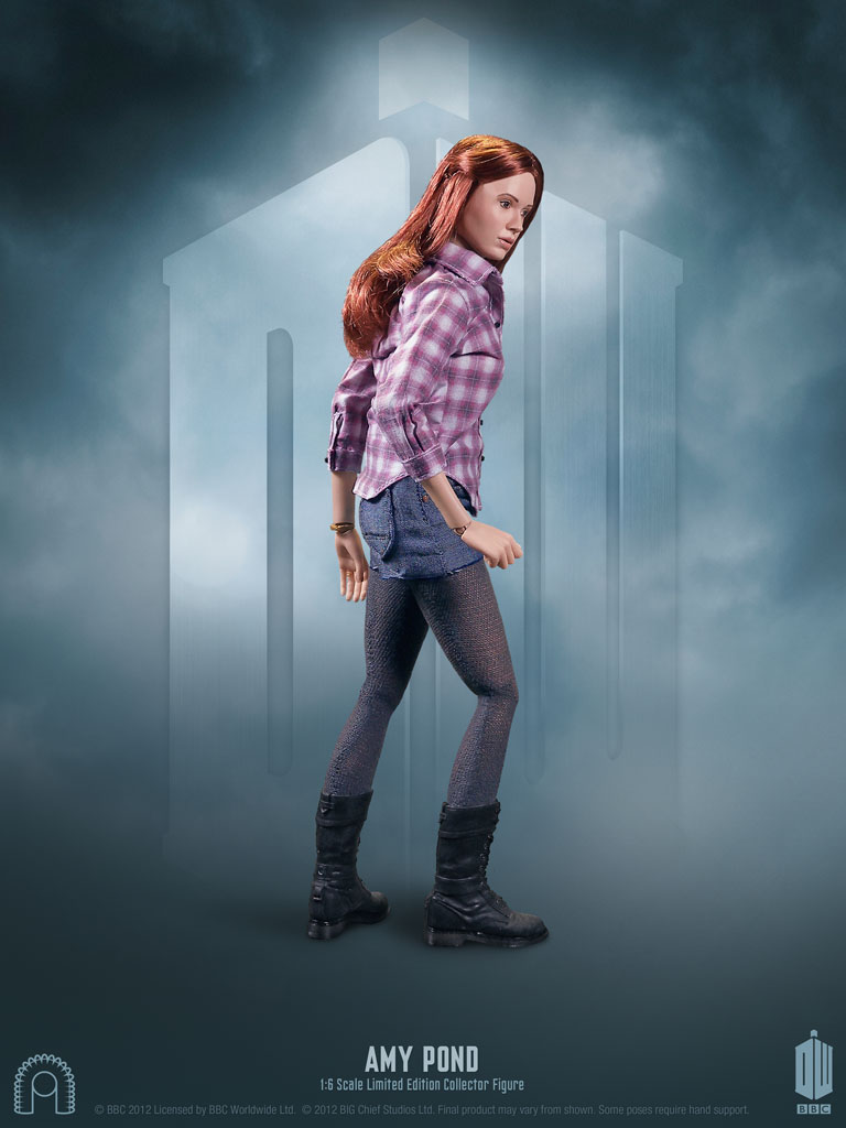 Big Chief reveals that their next 1:6th scale Doctor Who figure will be Amy Pond. The figure, which joins the Eleventh Doctor (Matt Smith) in the series, features a fully realised character portrait of "the girl who waited" as portrayed by actress Karen Gillan, authentically styled hand-tailored detailed costume, signature accessories and a partial TARDIS display base.