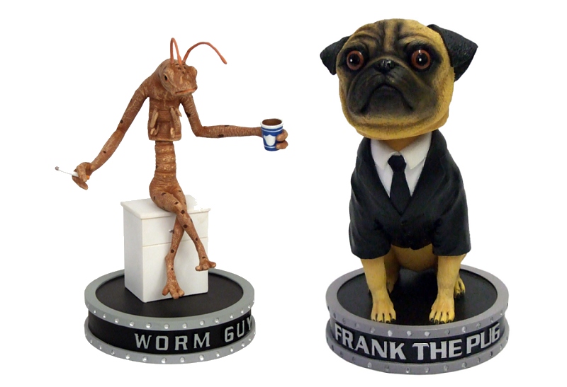 In addition to their Neuralyzer Prop Replica (see our story HERE), Factory Entertainment will be rolling out Men In Black II bobble heads. Called Shakems, this collection includes The Worm Guy (7-inches tall) taking a coffee break and Frank the Pug (8") portrayed in his MIB agent suit and tie.