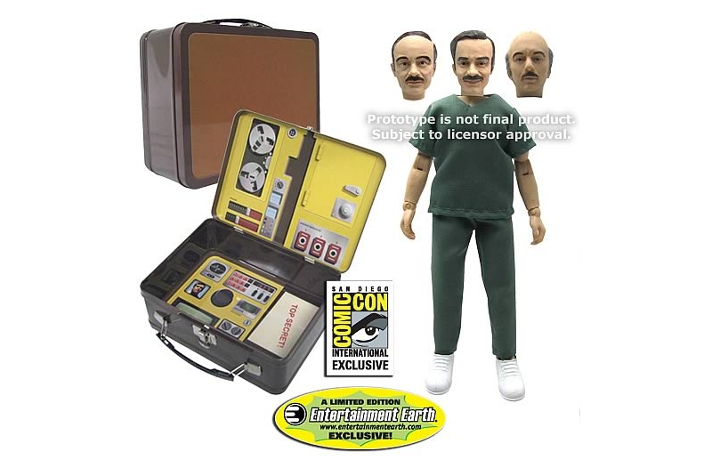 Includes 8" Dr. Rudy Wells, Steve Austin's physician, with interchangeable heads depicting all three actors who played the part: Martin Balsam, Martin Brooks, and Alan Oppenheimer. The lunch box emulates Oscar Goldman's briefcase.