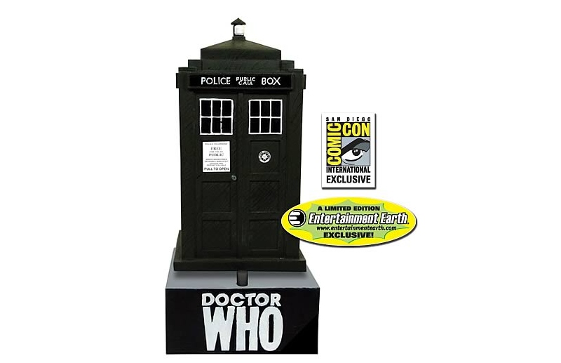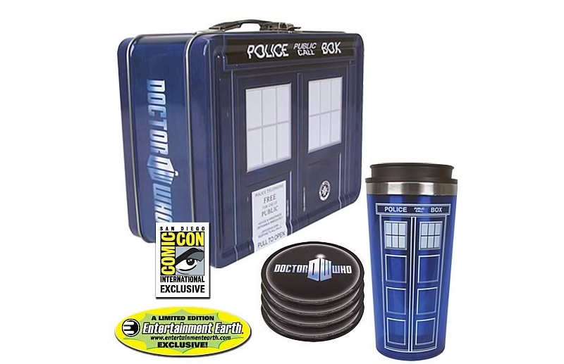 This exclusive tin tote looks just like a TARDIS and includes Doctor Who-themed coasters and a TARDIS-design travel mug.