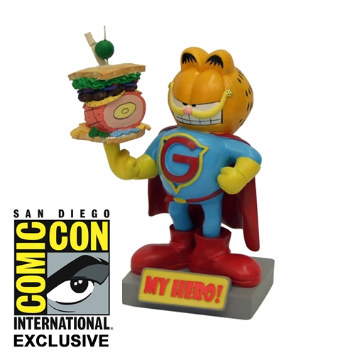 A Shakems Premium Motion Statue of the acerbic cat, Garfield, in his superhero form. A detailed polyresin collectible, this mighty piece stands 7” tall. His huge sandwich, a light snack for Garfield, is mounted on a spring so that it wobbles on the end of his fingertip tantalizingly. Supplied in a full color branded window box.