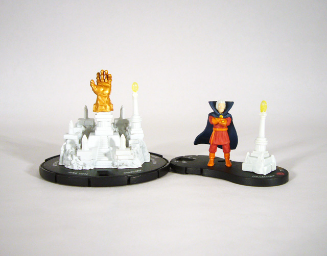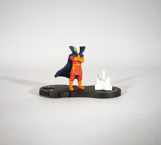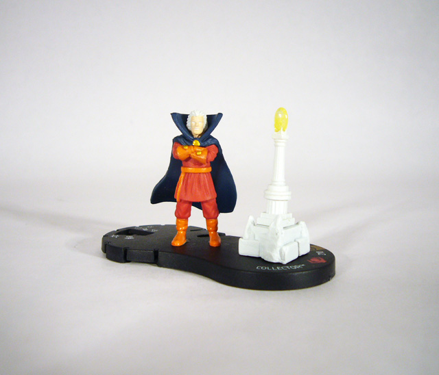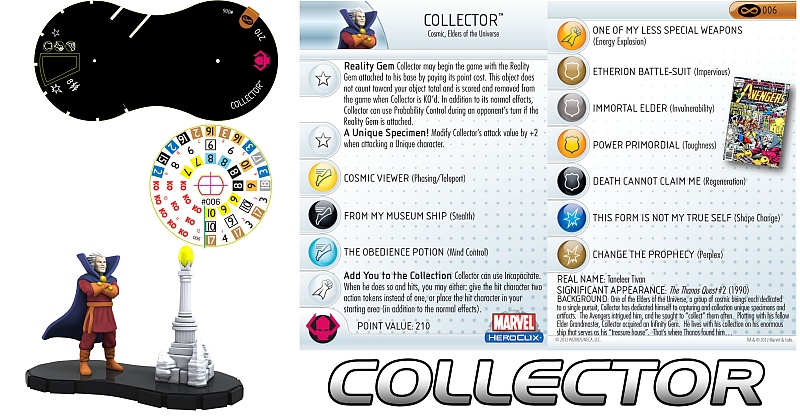 In game terms, the Collector is a mid-range Elder of the Universe clocking in at a stately 210 points. He has the requisite Power Cosmic Team Ability so his powers can’t be outwitted and he can act without taking pushing damage. As with the other Elders the Collector can start the game with his particular gem (you still have to pay its cost), and his double-sized "peanut" base has a special post to accommodate it. He also has another trait that perfectly portrays his search for collectibles; "A Unique Specimen!" modifies the Collector’s attack by +2 when attacking a Unique character! On the dial the Collector has solid stats and a neat array of powers making him fun to play but not overpowered.