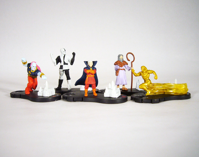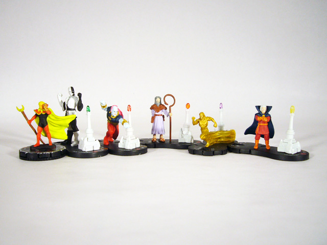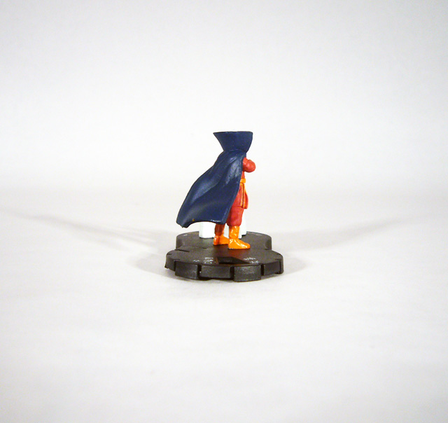 The Collector's powers progress in blocks, starting with Phasing/Teleport, the cool special power "Add You to the Collection" giving him a souped-up Incapacitate (apply two tokens or one and place the character in your starting area), and Impervious for three clicks. After taking a hit the Collector goes into hiding and switches to Stealth, Energy Explosion, Invulnerability, and Shape Change for two clicks. The next phase of his dial features Mind Control, Toughness, and Perplex for two clicks, while click #7 sees the brief return of "Add You to the Collection." Finally the Collector finishes out his dial with a potent two click combination of Phasing/Teleport to run away, Regeneration to heal, and Shape Change to avoid getting KO'ed!