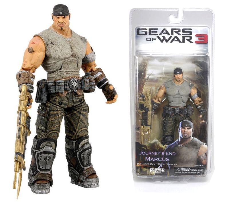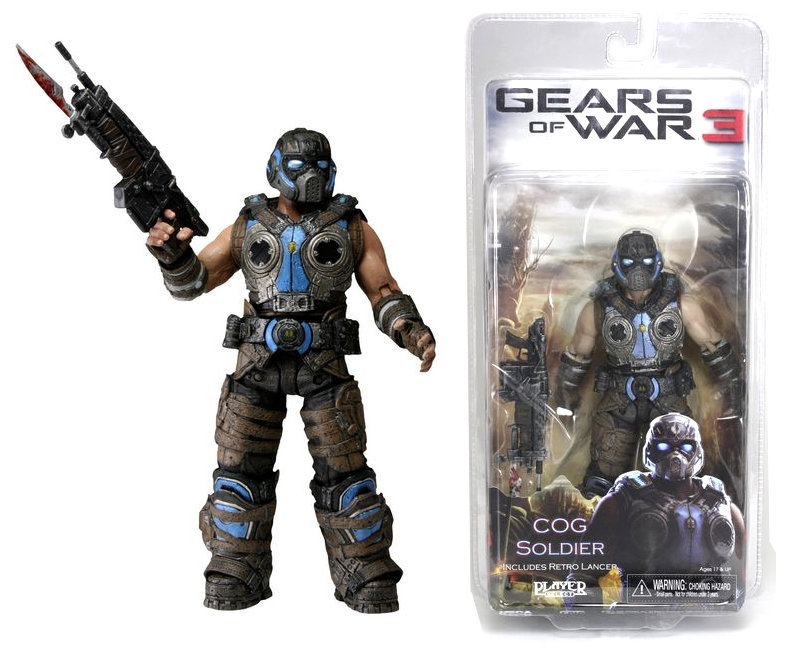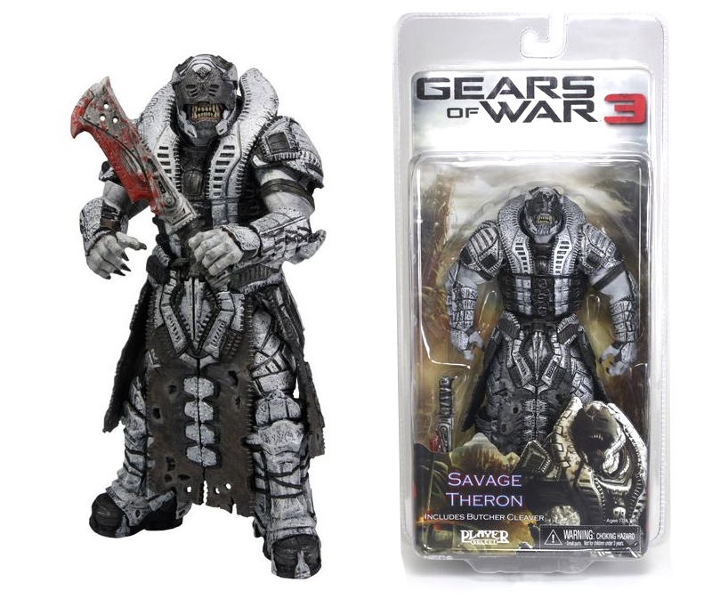 NECA provides a packaged look at their third exciting assortment of Gears of War 3 action figures. Shipping to retail now, this series includes Journey's End Marcus with a new casual look and Gold Retro Lancer, an all-new COG Soldier (love that helmet) with Retro Lancer, and two different versions of the Savage Theron, both armed with the brutal Butcher's Cleaver.