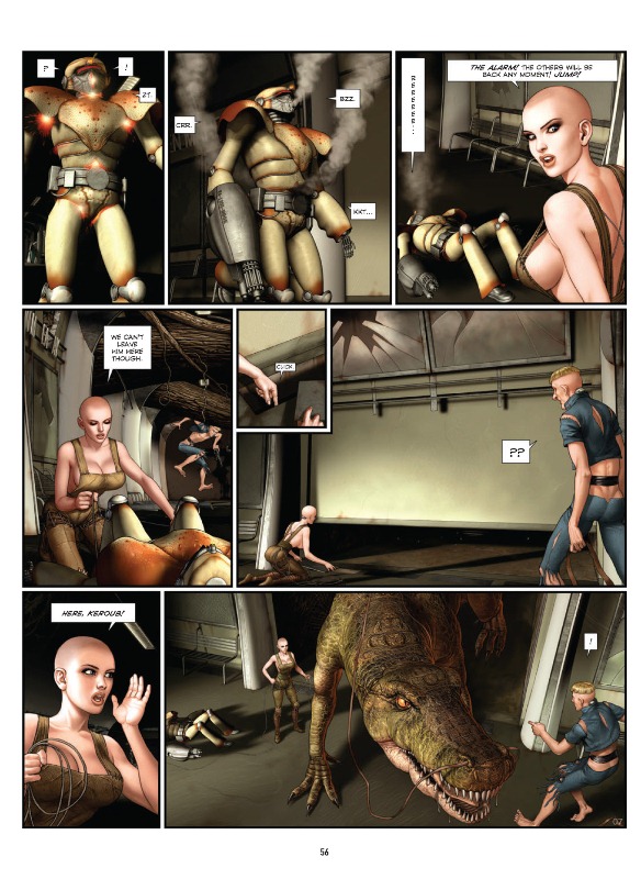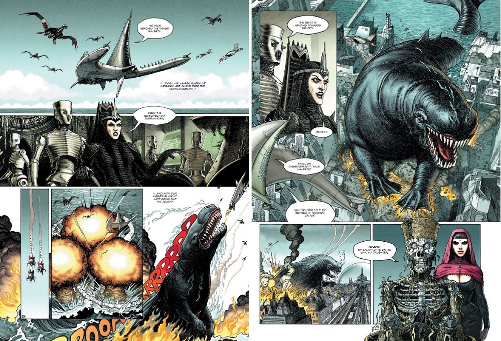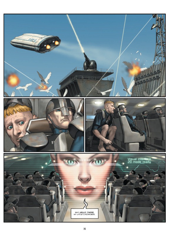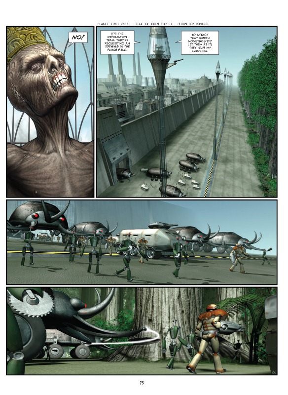 As for the artwork, fans of Beltran will appreciate the artist's work here. The first two of the three books in the trilogy are completed using computer aided, 3D design software while the last book is done by traditional hand. Personally, I'm a fan of the CG artwork (above) in the first two books as it provides an engaging and impressive difference when compared to other comics. That said, maybe Beltran lost the war (or at least grew tired of the battle) and reverted back to his more traditional, hand-drawn artwork (below) in the final book of the series. While somewhat of a distraction, it could be said this change perfectly fits with the books conflict and theme, though from what the artist says in book's introduction, it wasn't intentionally done for that purpose.