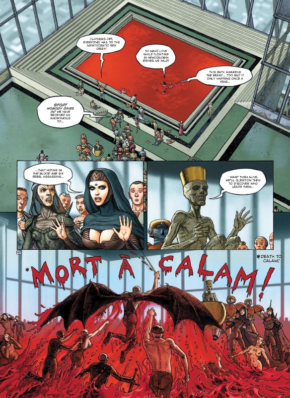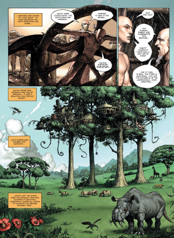 In this rich, twisted sci-fi story, readers discover hippodriles, enormous, highly-intelligent crocodile-like creatures which loyally serve their human masters; emotional crustacean-like robot warriors who fire lasers from their hands; a royal family ruled by the undead King Yod, Queen Marea, and Princess Kavatah; and a hunchback named Zerain who, after battling with other tribal chiefs, sprouts wings and declares war on Megalex. Confused already? Don't be. It's actually much easier to understand throughout the course of the story. While Megalex may seem convoluted to some, to fans of Jodorowsky's other works, this is par for the course and actually fairly easy to follow. Simply put: the royal family who runs Megalex with an iron fist wishes to destroy the forest and those who live both there and underground, forever ensuring their reign of terror and drug-induced labor. Those who live in the forest revolt and battle for equality, fair treatment, and peace.