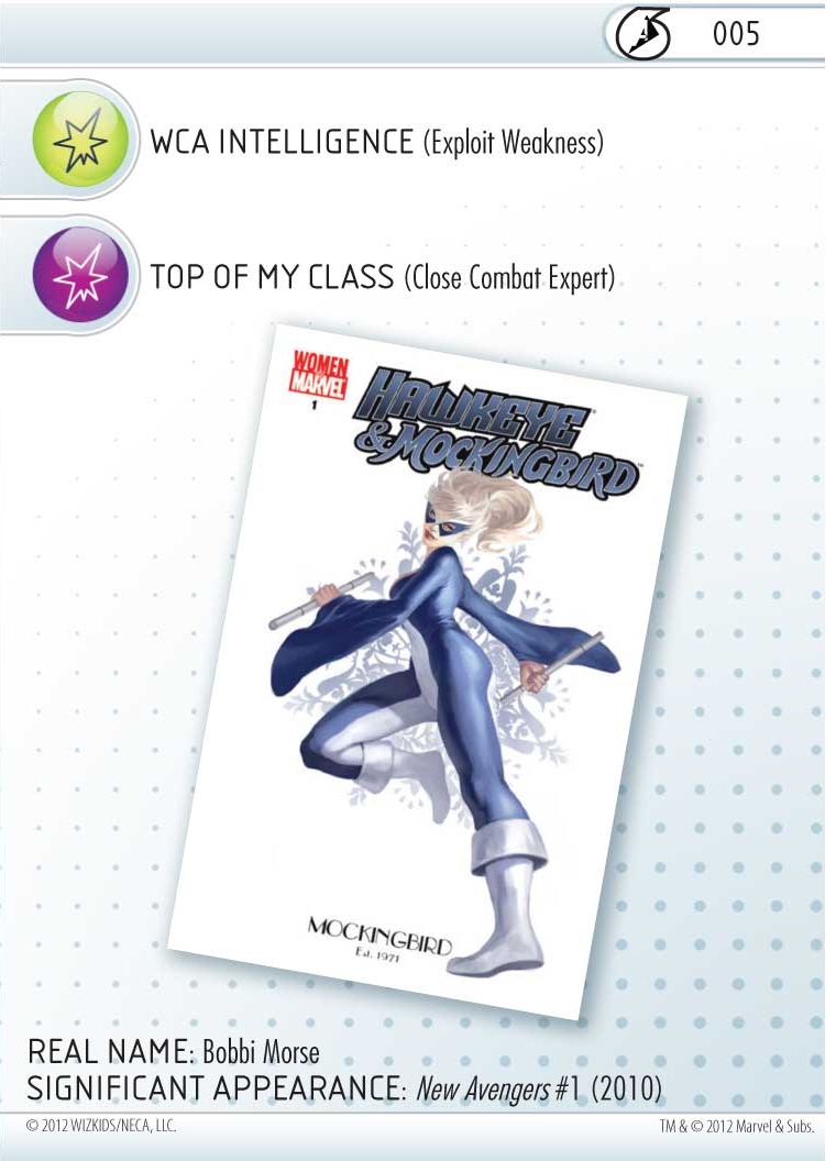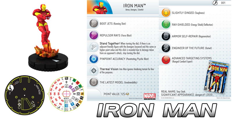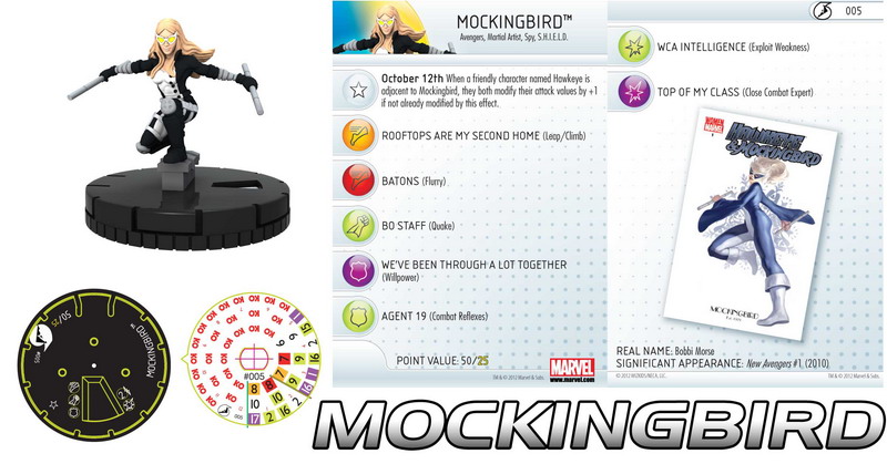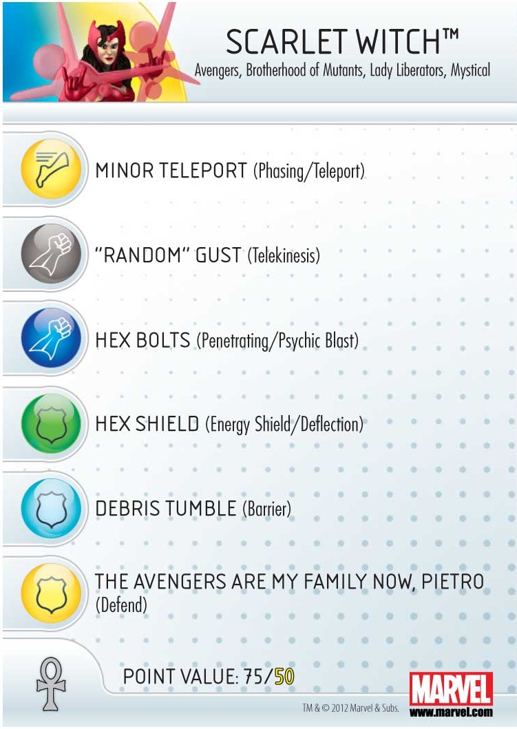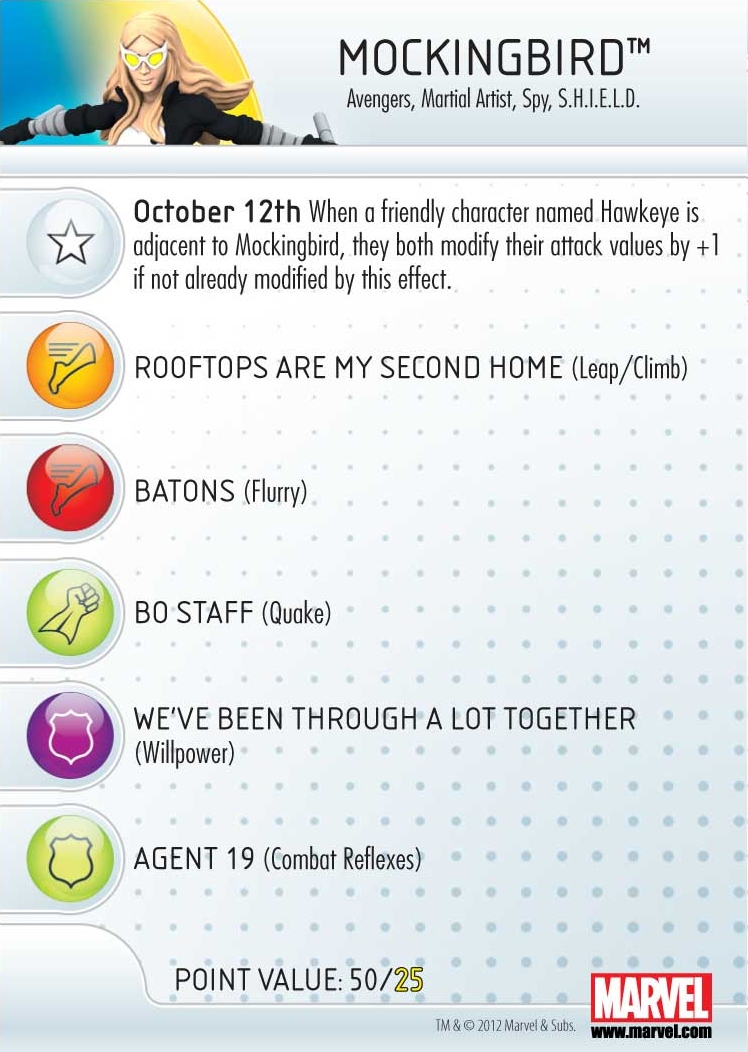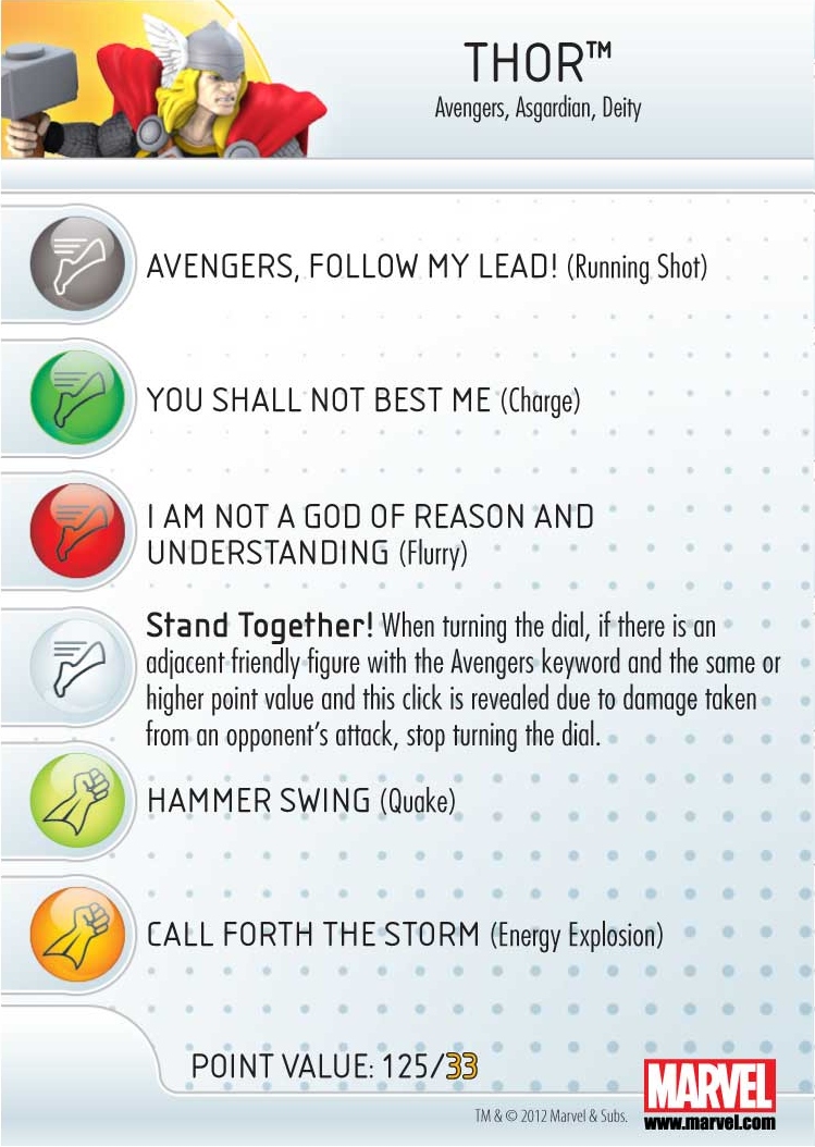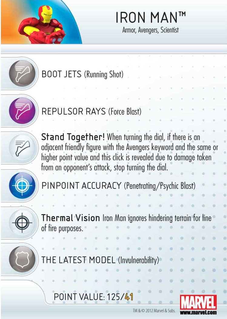 Cap is good at both close and ranged combat with no fewer than 10 standard powers PLUS one special power at the beginning of his dial that’s like a super version of Leadership and another at the very end that stops damage taken when it appears if another Avenger (of equal or higher point value) is adjacent - both Thor and Iron Man share this power. The god of thunder is Indomitable, starts with ranged attacks (Running Shot), and then moves in to batter his opponents with Charge, Flurry, Quake, Exploit Weakness, Close Combat Expert, and more. This version of Stark’s suit is a Sharpshooter so he can blast away at adjacent opponents and he does it very well with Running Shot, Penetrating/Psychic Blast, some Outwit, a special power that lets him ignore hinder terrain for line of fire purposes, and more. Interestingly, all of these Avengers have at least some range (from Mockingbird’s 2 to Thor’s 8), while only Scarlet Witch has a Team Ability (the always deadly Mystics).