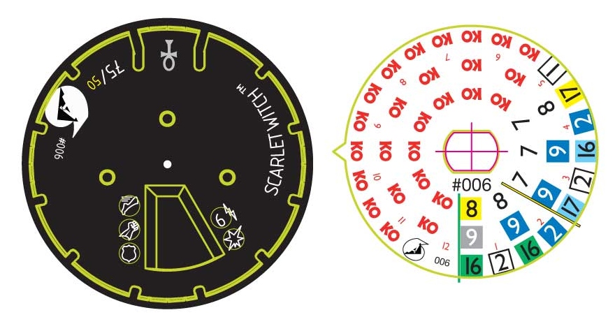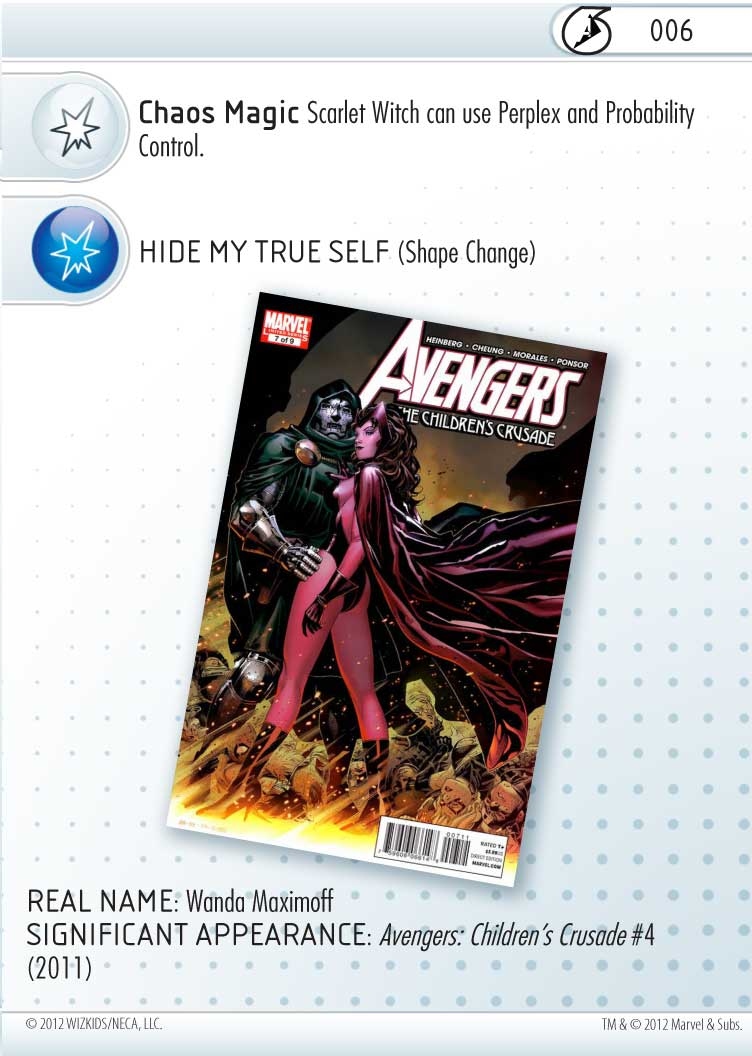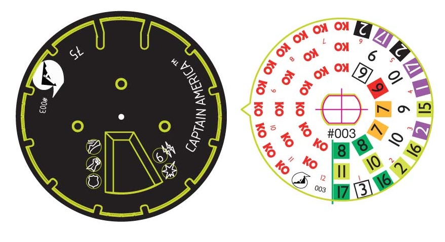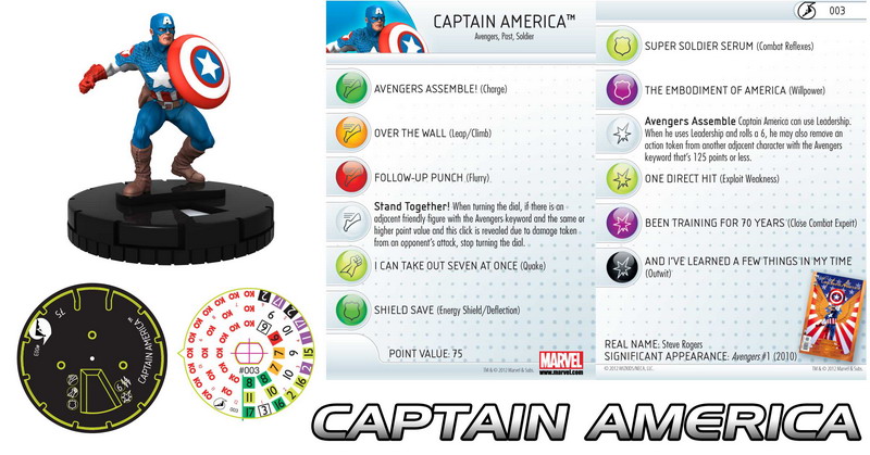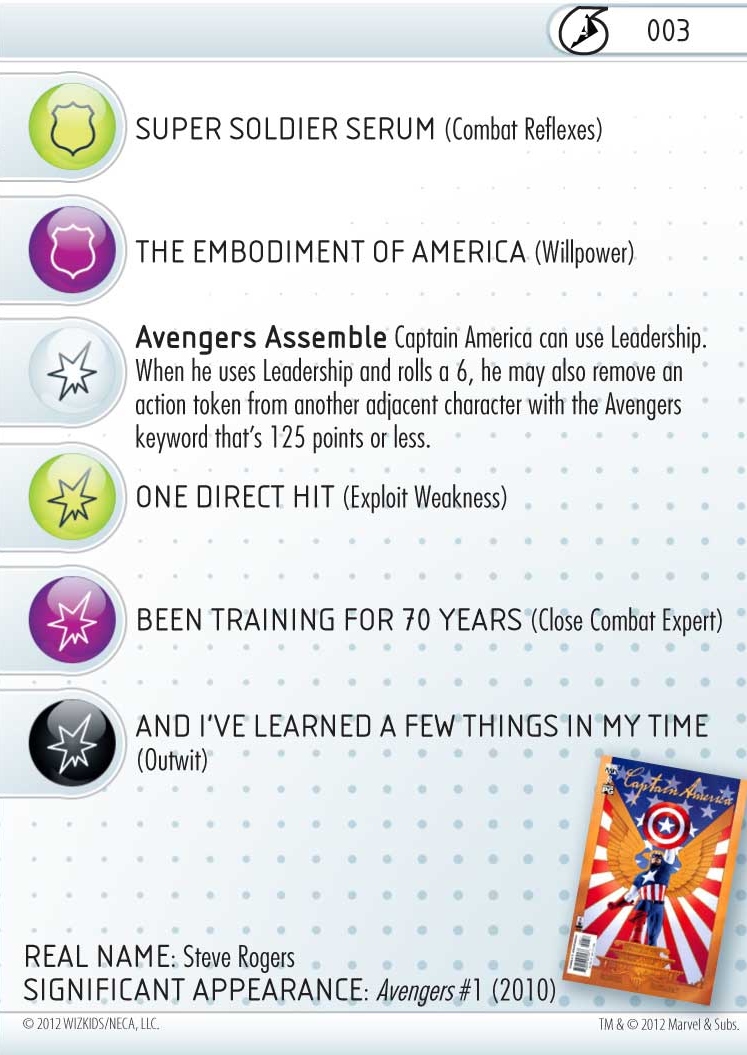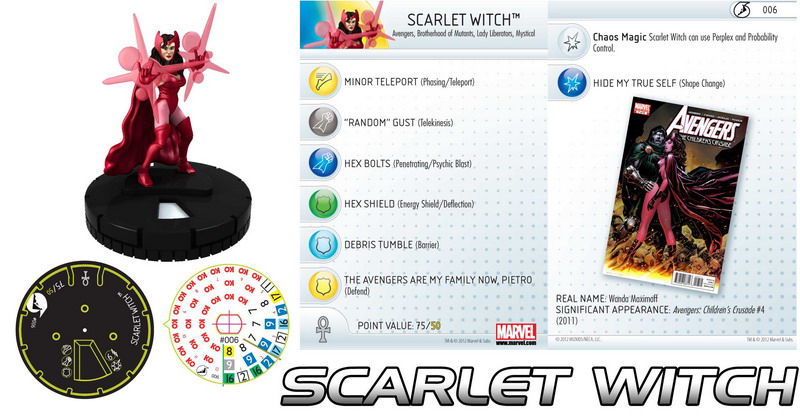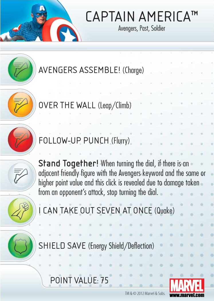 Cap is good at both close and ranged combat with no fewer than 10 standard powers PLUS one special power at the beginning of his dial that’s like a super version of Leadership and another at the very end that stops damage taken when it appears if another Avenger (of equal or higher point value) is adjacent - both Thor and Iron Man share this power. The god of thunder is Indomitable, starts with ranged attacks (Running Shot), and then moves in to batter his opponents with Charge, Flurry, Quake, Exploit Weakness, Close Combat Expert, and more. This version of Stark’s suit is a Sharpshooter so he can blast away at adjacent opponents and he does it very well with Running Shot, Penetrating/Psychic Blast, some Outwit, a special power that lets him ignore hinder terrain for line of fire purposes, and more. Interestingly, all of these Avengers have at least some range (from Mockingbird’s 2 to Thor’s 8), while only Scarlet Witch has a Team Ability (the always deadly Mystics).