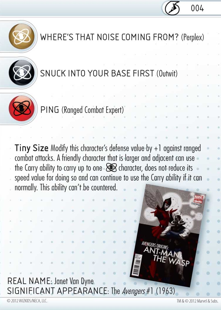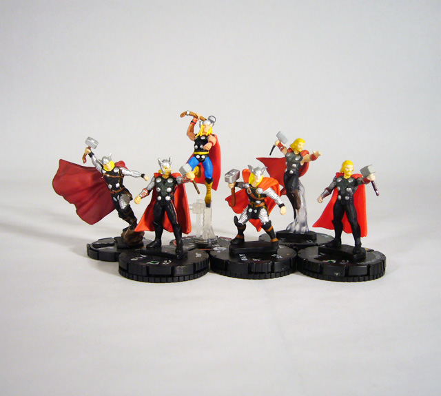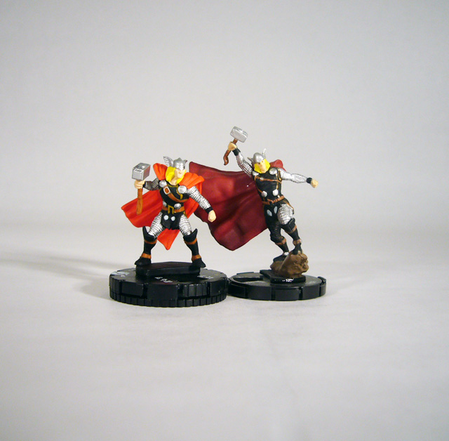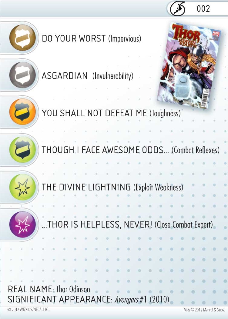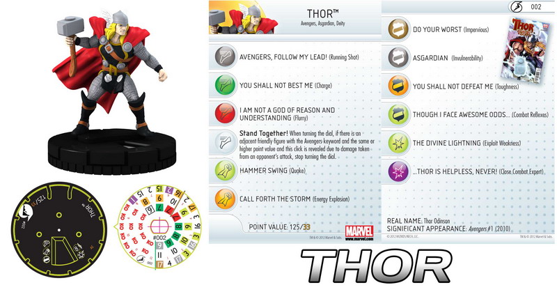 You’ll find that you can easily create 300 point teams with Iron Man, Thor, and Wasp or Thor, Captain America, Scarlet Witch, and rookie Mockingbird. Finally, summon all six figures at their full point values for a 500 point team of Earth’s Mightiest Heroes. Both Thor and Iron Man have the Alter Ego notation, so you can play their civilian identities of Dr. Donald Blake and Tony Stark respectively and “turn into” modest versions of their heroic counterparts.