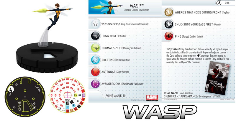 Following the trend in Fast Forces sets these Chaos War versions have some cool powers without making the figures too hard for new players to understand. Scarlet Witch is a solid attacker and team supporter with Telekinesis to move around her friends, Penetrating/Psychic Blast to use on her enemies, a little Defend, a little Barrier, and an intermittent special power granting her the use of both Perplex AND Probability Control. Mockingbird has a suite of powers to get her up close to her enemies and then beat on them, while her trait “October 12th” boosts hers and a Hawkeye figure’s attack values when they are adjacent (note that there is a new Hawkeye in the Chaos War booster set). Wasp debuts the new “Tiny Size” mechanic with a trait that lets her break away automatically, while she’s even harder to hit with Stealth, Super Senses, Perplex, and Outwit; for offense she starts with Incapacitate and switches to Ranged Combat Expert.