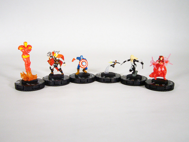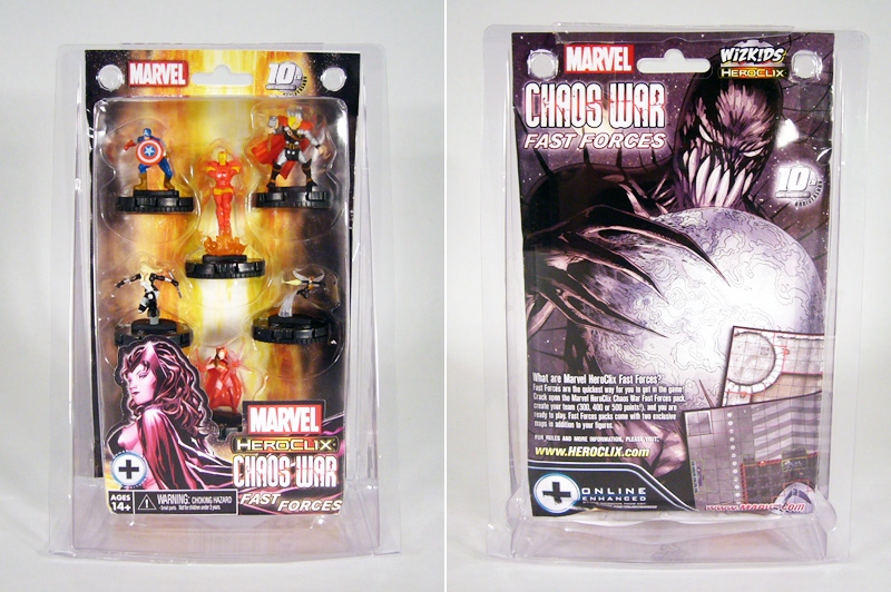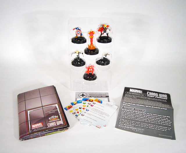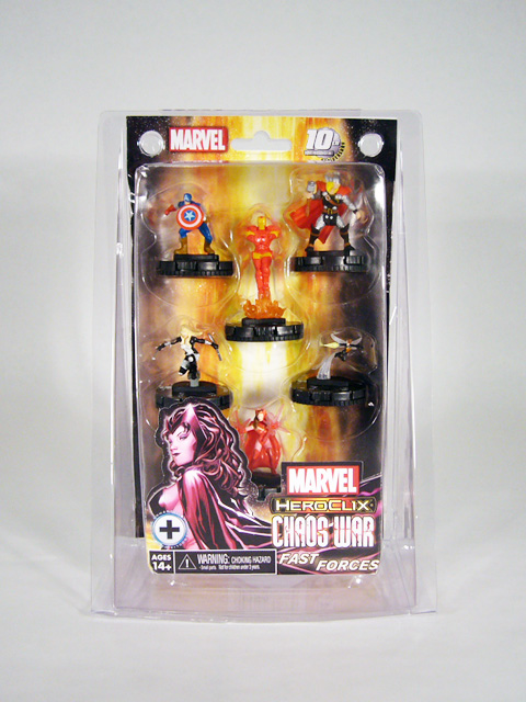 June and July are two big months for HeroClix this year with the release of the DC Batman: Dark Knight Rises set and the Marvel Chaos War expansion. As part of the latter players will be able to collect not only the booster set (with more than 50 figures), but also the already released Countertop set, and a Fast Forces pack that we’ll be taking a close look at today! Perfect for new players (and veterans too), Fast Forces sets include six figures with complementary point values so you can easily build a team right out of the box and start playing. As Chaos War heavily features Marvel’s greatest superhero team, it’s fitting that the Chaos War Fast Forces pack offers players several Avengers teams to choose from. With sculpts drawn from the booster set that comes out on the same day (July 11th), the FF has new dials for Iron Man, Thor, Captain America, Wasp, Mockingbird, and Scarlet Witch plus a brand new double-sided map!