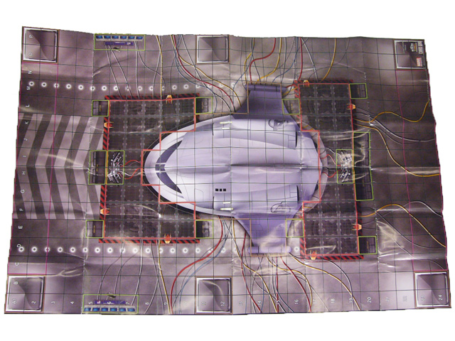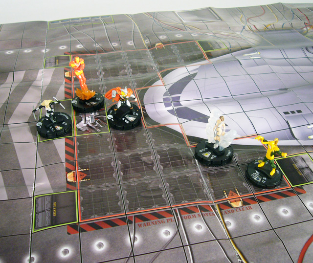 On the other side of the map is the jaw-dropping “Quinjet Hangar” (above), an indoor battlefield dominated by a huge blocking terrain jet in the center. Attached to the front and rear of the Quinjet are elevated platforms with some hindering terrain computer terminals, and sections of both hindering and blocking terrain line the long walls. Similar in some respects to maps that have come before it (Metropolis and the Airbase), the Quinjet version has a much bigger blocking obstacle in the center that’ll really pose an interesting challenge for teams to get around it.