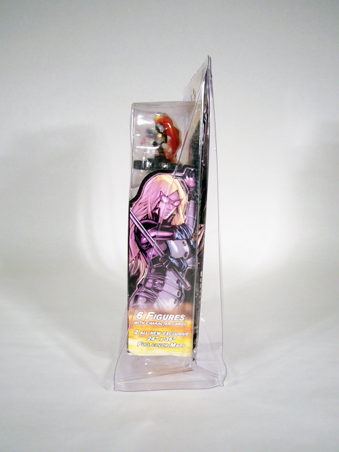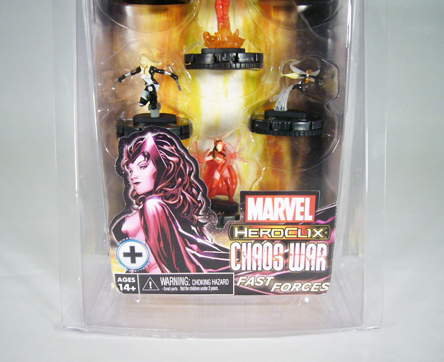 Just like previous Fast Forces sets (see our review of “The Uncanny” Giant-Size X-Men set HERE), the Chaos War version retains the functional and easy to spot packaging we’ve come to expect. A sturdy clamshell displays the six figures while a decorated sleeve behind them holds all of the paper contents: map, character cards, etc. In this case, the Avengers stand out prominently with a fiery backdrop behind them. The insert in front of the figures features a haughty Scarlet Witch at the bottom next to the name of the set, while Mockingbird appears on the side. The back panel is dominated by a huge image of the Chaos King with a description of the Fast Forces.