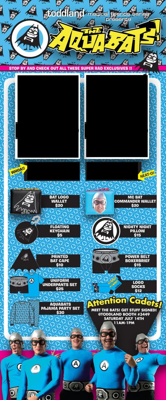 Holy caped crusaders, it the Aquabats! Toddland has created some incredibly rad merch for the San Diego Comic-Con bearing the Aquabats iconic logo... a Bat Logo and MC Bat Commander wallet ($20), a Floating Keychain ($5), a Nighty Night Pillow ($15), Bat Cape ($10), Powerbelt Boxers ($15), Uniform Underpants Set ($25), Socks ($12) and Aquabats Pajama Party Set ($30). Also be on the look-out for a secret release yet-to-be-revealed.